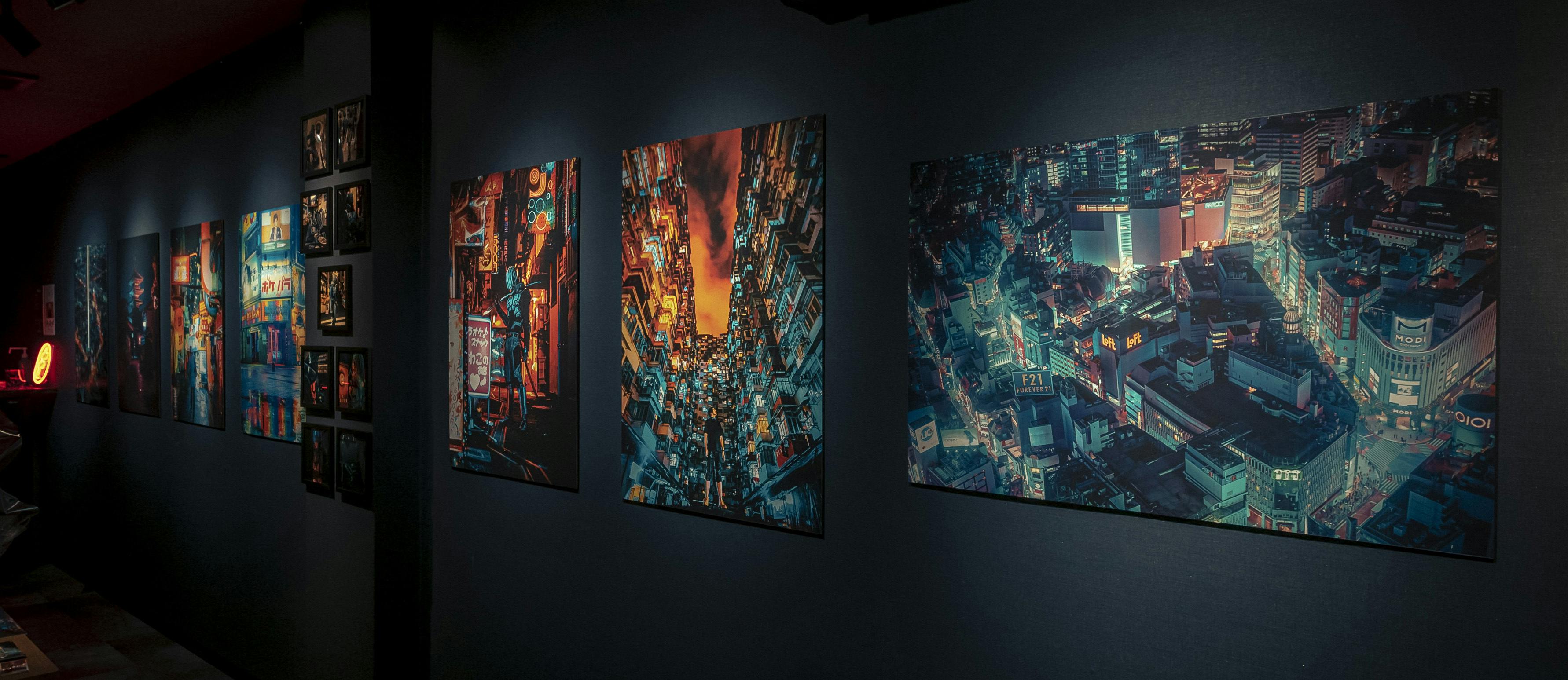上記で紹介した8つのサイバーパンクのテーマの写真を各一枚ずつA1サイズでプリントし展示。