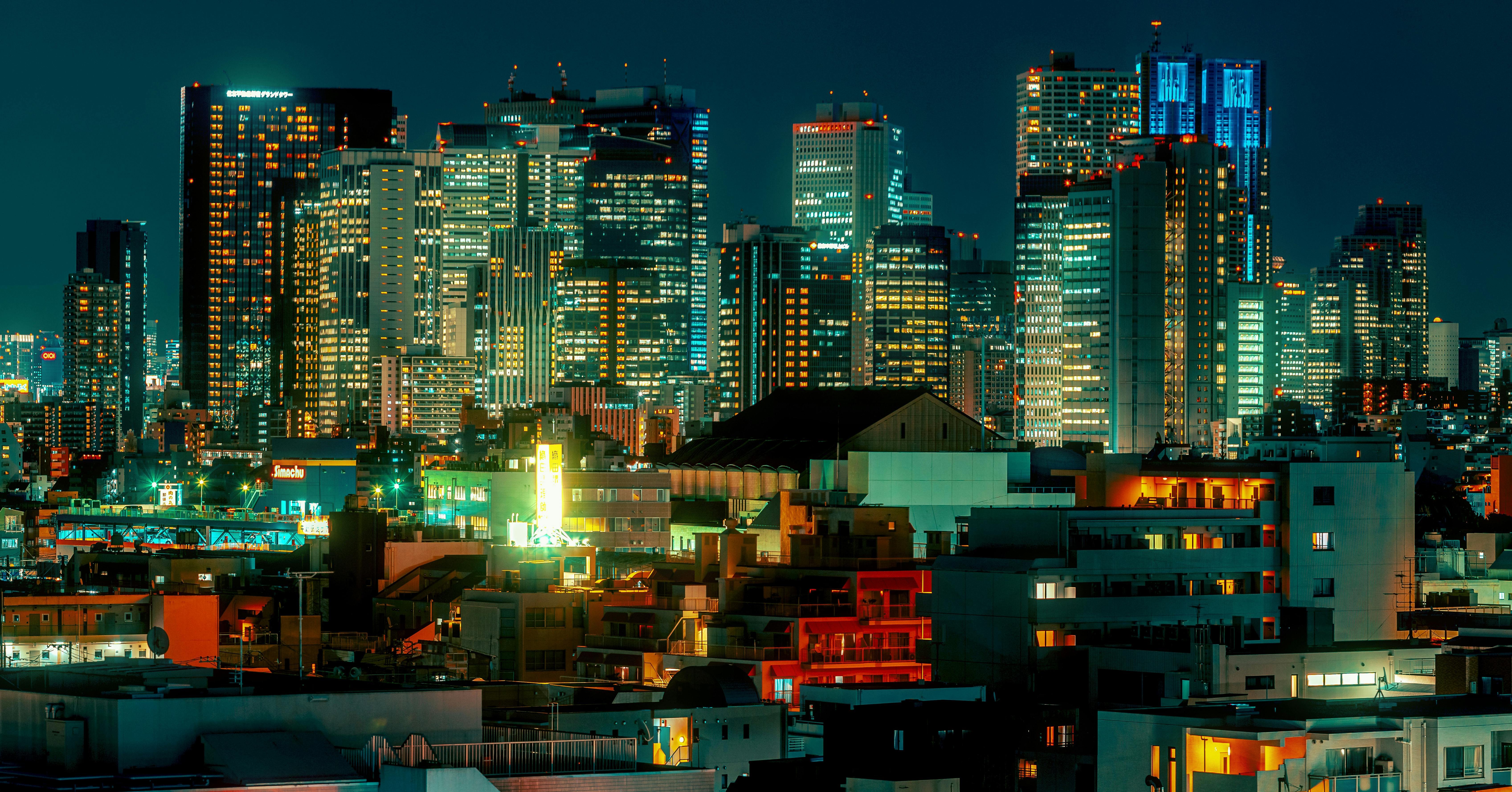 夜の街を照らすのは街頭ではなく看板やビジョンなどの色がついた光。
