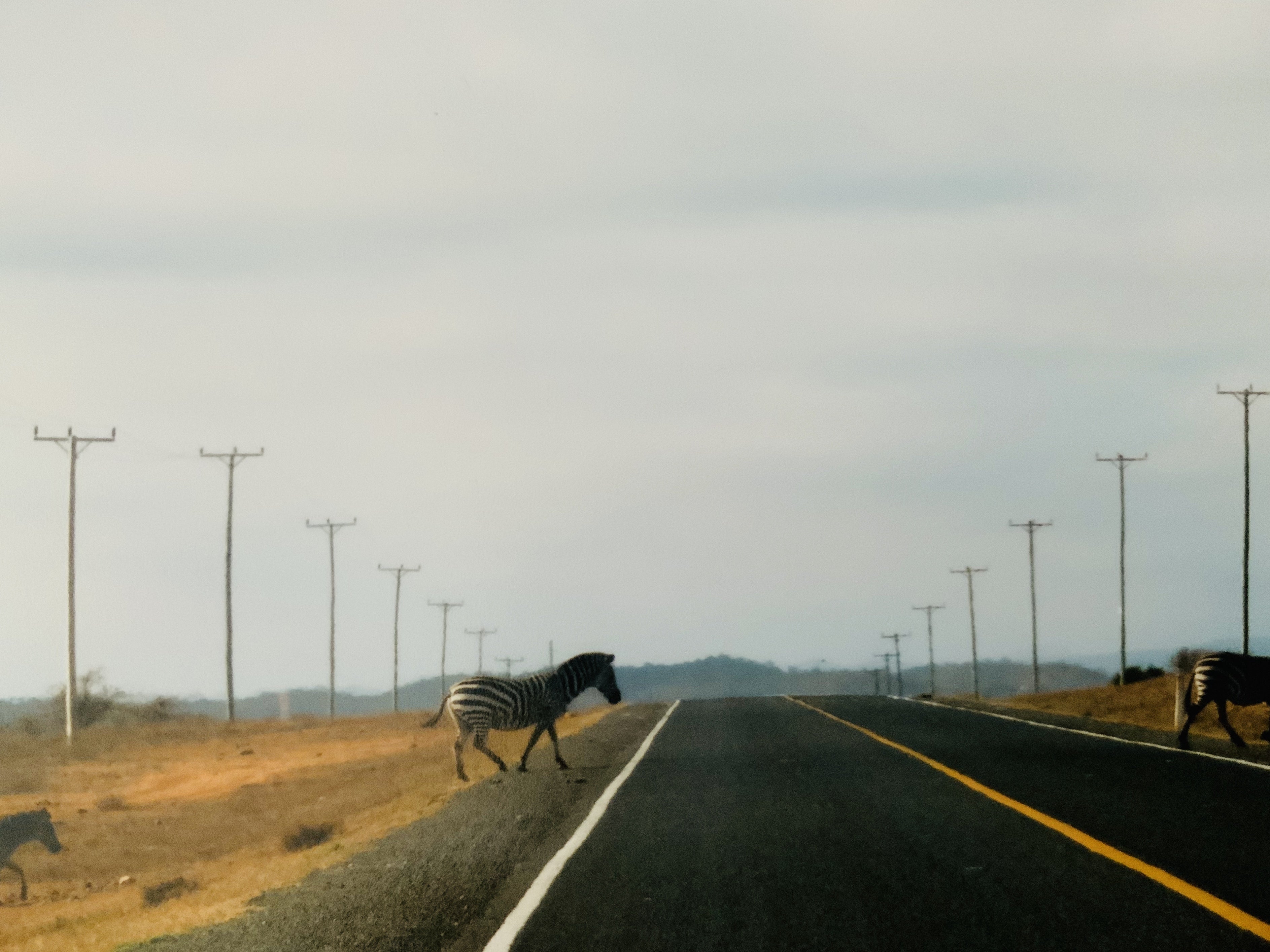 幹線道路を横切るキリンの群れ
