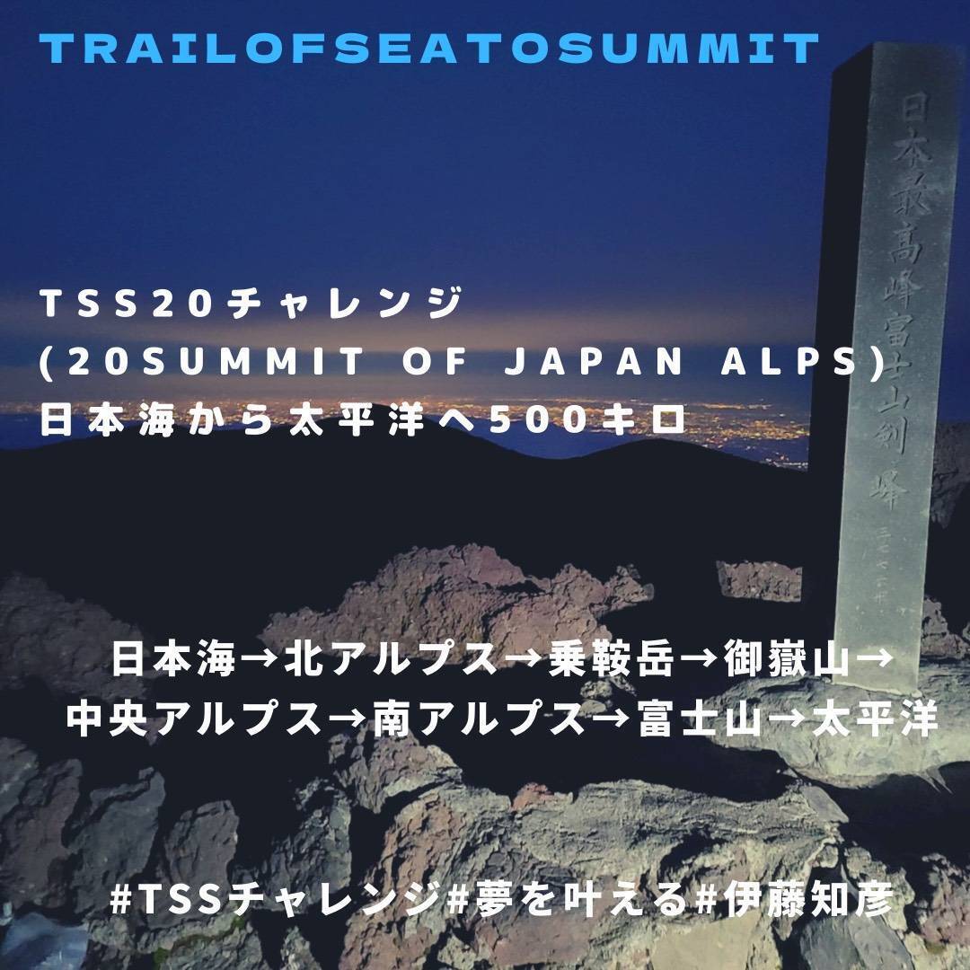 2021/09/21 21:11TSS20チャレンジ(20summit of japan alps)は本日目的地の田子ノ浦に無事ゴールできました!多くの皆さんからの応援ありがとうございました!今回のチャレンジの報告会(オンライン)などの予定は、ご支援いたただい皆さんに後日メッセージをお送りいたします。Tシャツなどのお礼の品の発送は10月中を予定しています。クラウドファンディングは9月末まで受け付けさせていただきます。以下、伊藤さんからのメッセージです!日本海→北アルプス→乗鞍岳→御嶽山→中央アルプス山脈→南アルプス→富士山完走させて頂きました!約500キロ、累積約36000m、12日17時間半(台風停滞1日)。一歩一歩目の前に集中して積み重ねたものが物凄いことに・・・。台風や嵐やアクシデントありましたが常に幸せ感じながら進んでいく事ができました。「全ての事象と出会った人全てが幸せになれますように」という願掛けとして日本海の海水を富士山剣ヶ峯とゴールゲートはじまりの鐘にかけさせて頂きました。今回は可能な限りのリアルタイム配信もチャレンジさせていただけたことも感謝感激しております。現地サボート頂いた方々LINEグループメンバーの方々SNSで応援頂いた方々含めて皆様と一緒に大縦走してきたという想いが強く印象に残っております。私の活動であるTSS(Trail of Sea to Summit)→海(理想)を山頂(実現)する→夢を叶えるということと、私の格言である「努力の大きさが感動の大きさに比例する」をまだまだ膨らませていきたいと思います。また皆様へも色んな形で還元してゆけたらと思っております。引き続きどうぞ宜しくお願い致します。本当にありがとうございました! もっと見る【TSS20チャレンジ】明日ゴール! ラスボス富士山!(9/20)