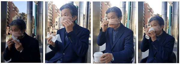 人との距離を保ち、換気ができる空間での食事において、モアレをつけたまま食事をしてみていただけませんか。口にものを入れるときだけ、モアレの下方を上に折り返してください。手を放してもそのままの位置にとどまってくれます。