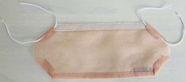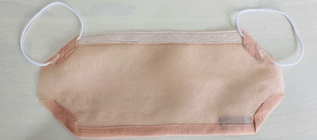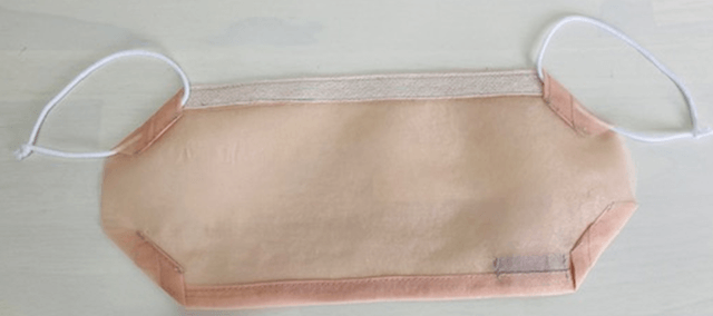 ゴムは長めに用意していますので、ご自身の顔のフィット感に合わせてゴムの長さを調節して結んでください。結び目はモアレ左右上部の折り返し部分にずらし入れ、結び目が直接顔や耳にあたらないようにしてください。