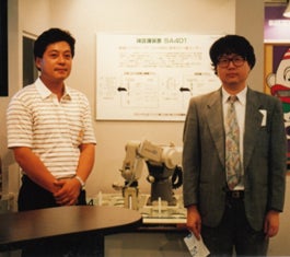 ↓30代の頃、信州博覧会(H5)で味センサを利用した「きき酒ロボット」を出展。味センサの開発者九州大学都甲教授(右)