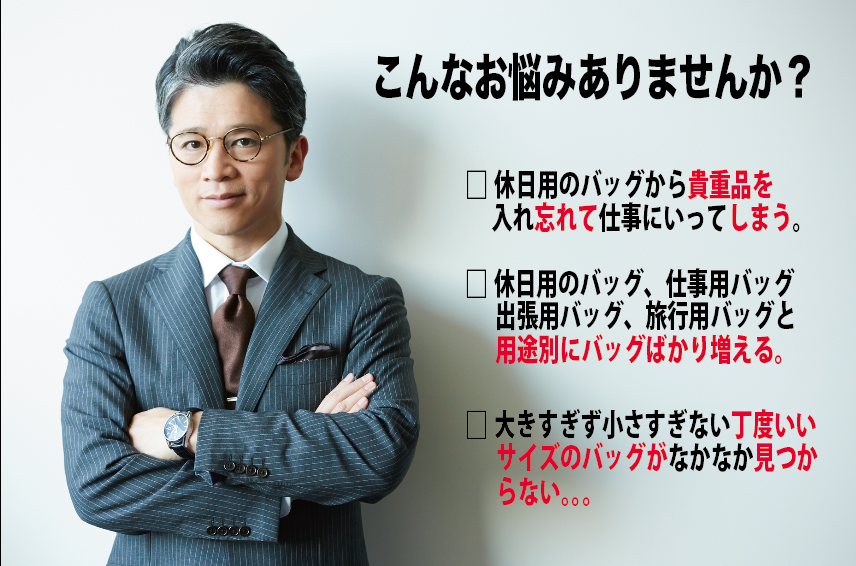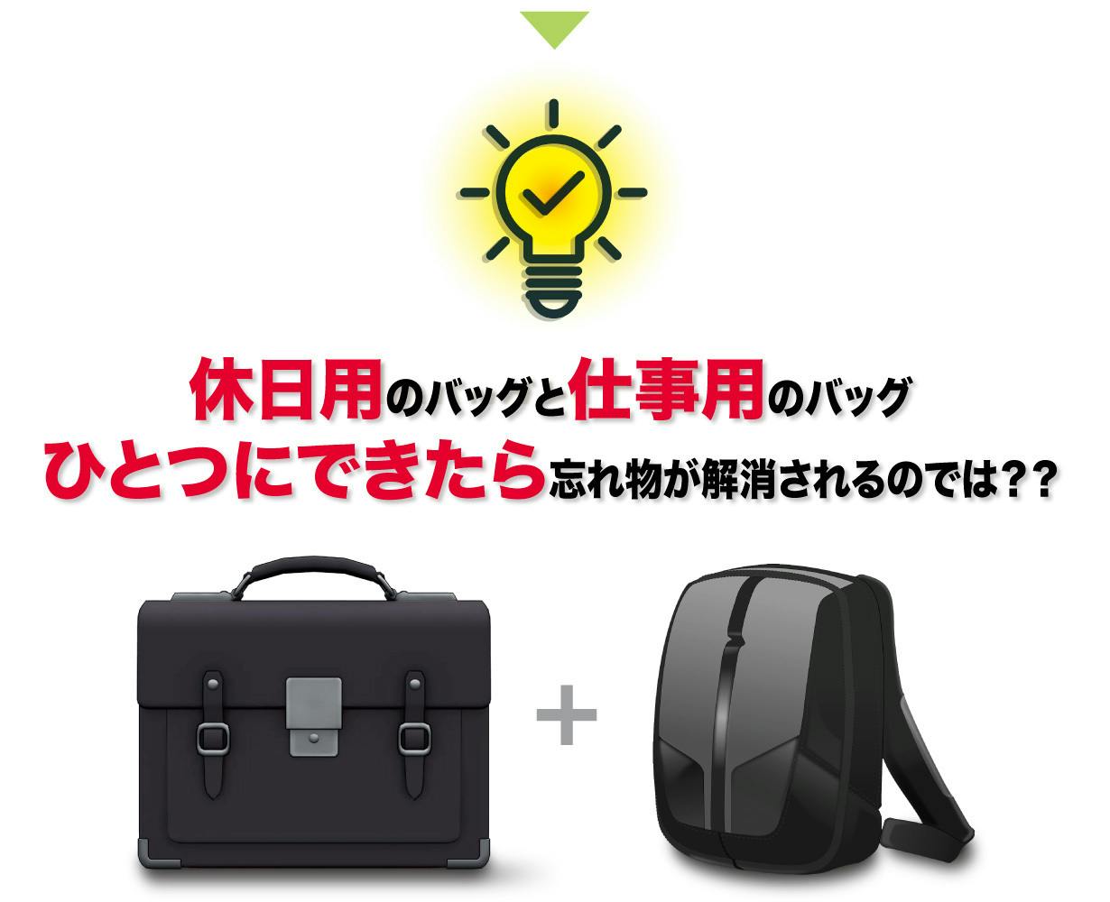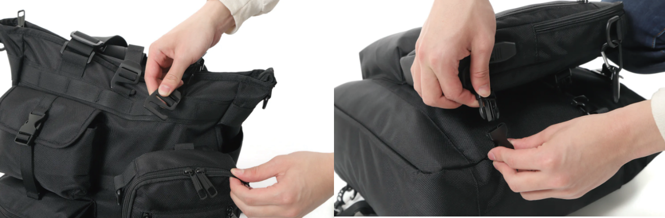 ビジネス用バッグと休日用バッグを統合(インテグレート)!入れ替えの作業が無いため忘れ物の発生を軽減。装着するのはバックルを3箇所を止めるだけ!わずか5秒で支度完了です。デザインは、仕事と遊びを両立させるアウトドアなテイストを取り入れ、あらゆるシーンにマッチするものにしました。