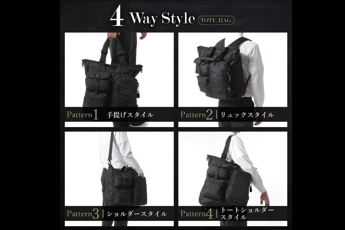 インテグレートバッグは、トートバッグ、ボティバッグのそれぞれが4WAYと4WAYに使用することができ、合計8通り=8WAYといった画期的な使用スタイルを選ぶことができます。