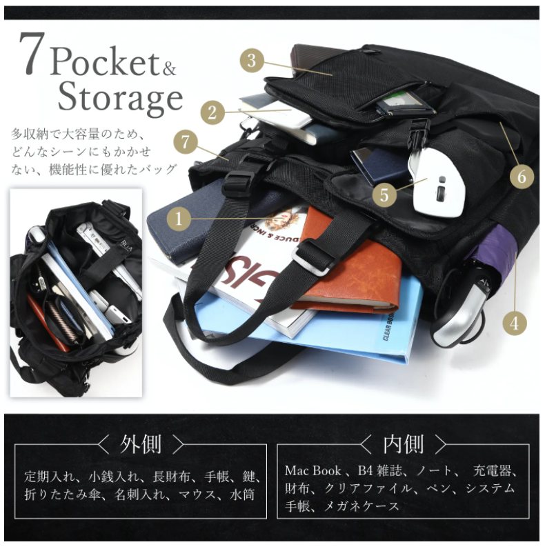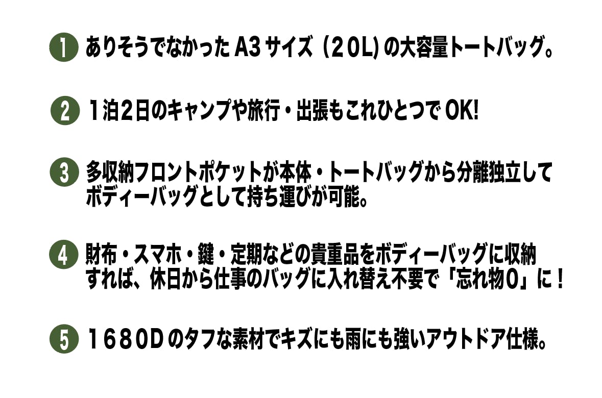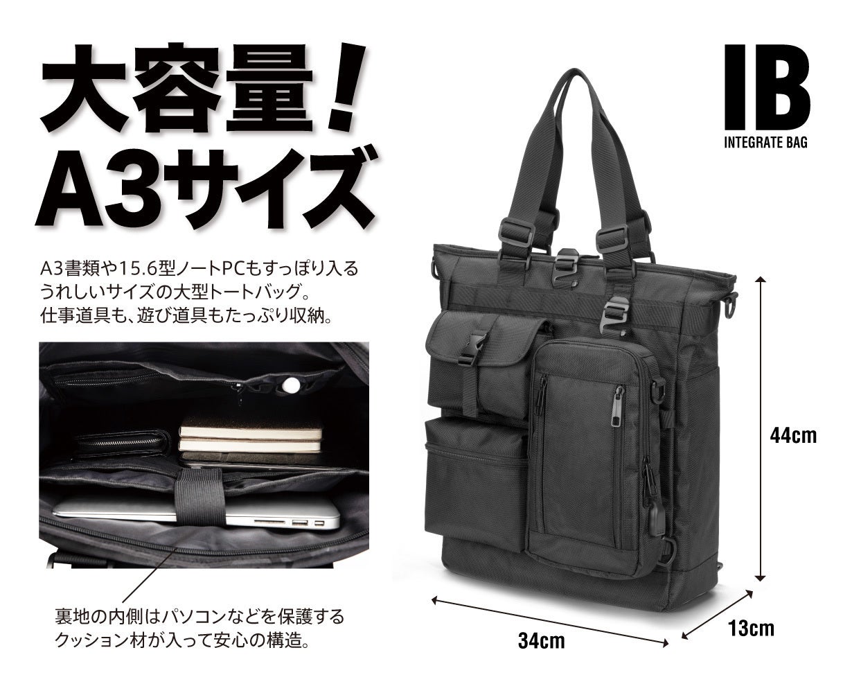 A3の書類もすっぽりそのまま入るトートバッグ。パソコンや書類と一緒に、一泊二日程度の着替えなら余裕で入る大容量!貴重品だけ持ち歩きたいときに、ボディバッグを分離できる便利さが出張や旅行先でも大活躍!