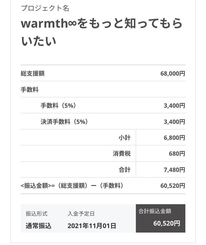 2021/10/01 13:05この度はご支援ありがとうございました。明細についてお知らせいたします。総支援額は¥68,000となりました。手数料の¥7480を引いた¥60520が活動費として11月に着金しますので着金後、活動を進めさせていただきます。ーーーーーーーーーーーーーーーーーーーーーーーーーーーーーー今後のスケジュールは11月 着金+広告の計画(写真撮影など)+贈呈作品の資材調達&作成12月 広告開始+贈呈作品の作成&発送1月 贈呈作品の発送の完了(できる限り早めに進めていきます。)※予定ですので変更もあります。その都度ご連絡致します。ーーーーーーーーーーーーーーーーーーーーーーーーーーーーーーwarmth∞の活動を御支援してくださった皆様また、SNSでの拡散に御協力くださった皆様日々お世話になっております皆様この度はありがとうございます。warmth∞の活動を責任をもって行っていきますのでこれからもどうぞよろしくお願いします。 もっと見る
