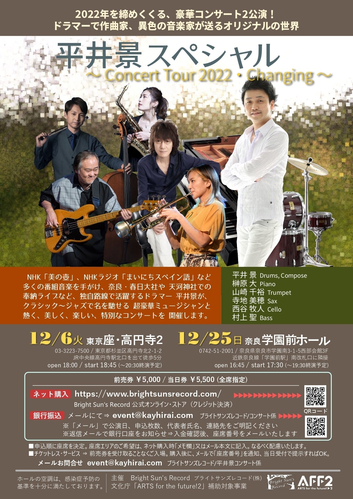 2022/11/16 18:01だいぶ秋めいてきましたね。気が付けば、今年も残り2ヵ月を切りました。アルバム『Something Jazzy~メロディ・イン・ザ・リビングルーム』のリリースから、4ヵ月。ツアーも、無事終了しました。良い作品が出来ましたのも、皆さまのお力を頂いたものと深く感謝しております。年末は、この作品の作曲とサウンドプロデュースを務めた、ドラマーの平井景さんのコンサートが、東京と奈良で開催されます!毎年、秋から冬にかけて開催する、恒例のコンサート。私も舞台監督として1からプロデュースして参ります。因みに、昨年の2021年11月26日、奈良・学園前ホールでのコンサートをダイジェストPVです! 最初から最後まで楽しい!元気をもらえます。「ジャズって、難しそう、、」という方、心配ご無用です。そして、そして今年は、まずタイトルがコレ!↓平井景スペシャル・Concert Tour 2022 ~Changing~な、なんと、副題に「Changing」という名が。。これは、あの『Something Jazzy~メロディ・イン・ザ・リビングルーム』にも収録の曲名がついています!という事は、、、。そう、皆さまにご支援頂いたCDからもお届けする予定なんです。CDとは、また一味も違うアレンジ、演奏。一期一会の貴重な瞬間を味わえる事間違いなしです。是非是非、お見逃しなく♪会場で私を見かけたら、声をかけてくださいね。現在、東京/奈良公演とも、チケット絶賛販売中です。全席指定ですので、どうぞお早めに。お待ちしております。■平井景スペシャル・Concert Tour 2022 ~Changing~出演:平井景(Drums, Compose)、榊原大(Piano)、山崎千裕(Trumpet)、寺地美穂(Sax)、西谷牧人(Cello)、村上聖(Bass)▼▼▼▼▼【東京公演】2022年12月6日(火)座・高円寺2(03-3223-7500 / 東京都杉並区高円寺北2-1-2)→JR中央線高円寺駅北口を出て徒歩5分■open 18:00 / start 18:45(~20:30終演予定)■チケット料金:¥5,000(全席指定)▼▼▼▼▼【奈良公演】2022年12月25日(日) 学園前ホール(0742-51-2001 / 奈良県奈良市学園南3-1-5西部会館3F)→近鉄奈良線「学園前駅」南改札口に隣接■open 16:45 / start 17:30(~19:30終演予定)■チケット料金:¥5,000(全席指定)==================【ネット購入】ブライトサンズレコード公式サイトhttps://www.brightsunsrecord.com/【銀行振込】event@kayhirai.com※「メール」で公演日、申込枚数、代表者氏名、連絡先をご明記ください※返信メールで銀行口座をお知らせ⇒入金確認後、座席番号をメールいたします【詳細】平井景ホームページhttp://www.kayhirai.com/▼▼▼▼▼2022年を締めくくる、豪華ホール・コンサート2公演!ドラマーで作曲家、異色の音楽家が送るオリジナルの世界 ━━━━NHK「美の壺」、NHKラジオ「まいにちスペイン語」など多くの番組音楽を手がけ、奈良「春日大社」「天河神社」での奉納コンサートなど、独自路線で活躍するドラマー平井景が、クラシック~ジャズで名を馳せる超豪華ミュージシャンと、熱く、美しく、楽しい、特別なコンサートを開催します。毎年恒例のホール・コンサート、本拠地の東京 (12/6) と、故郷の奈良 (12/25) のみの限定公演。“六重奏”で魅せるアーティスト達の共演!この機会をお見逃しなく!・・・・全ては移ろう、移りゆく。そこにも、”希望”を感じて。心に響くメロディをお届けします。 もっと見る