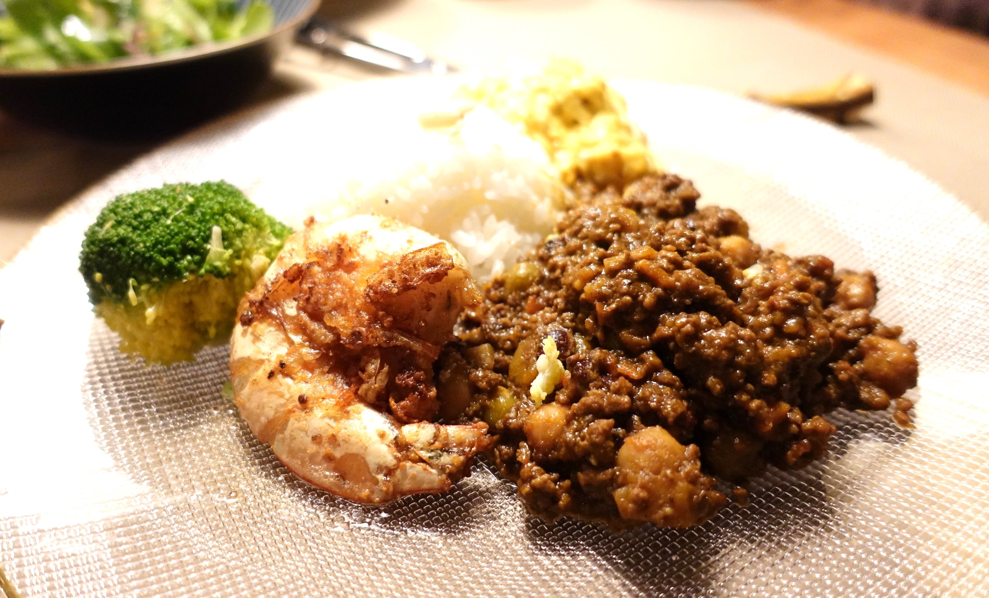 録音後は、平井さんお手製のお食事を頂きました。今回は、大好物の豆と挽肉のカレー・ガーリックシュリンプ添え。スパイスのきいたドライカレー風で美味しいんです‼