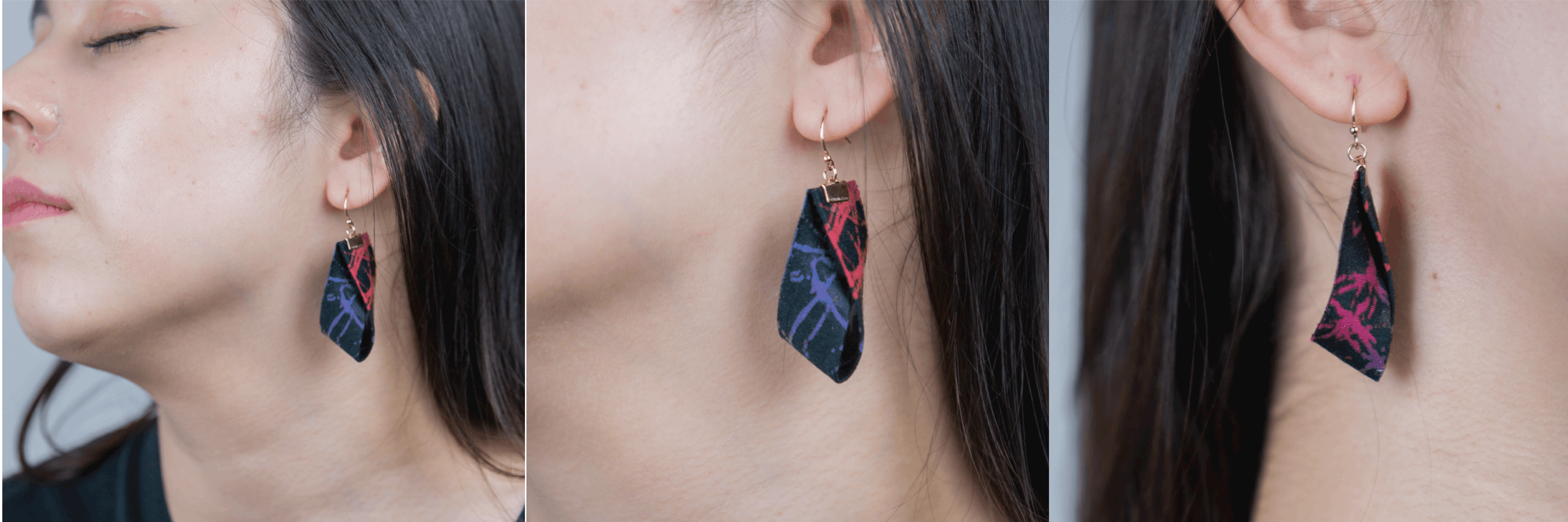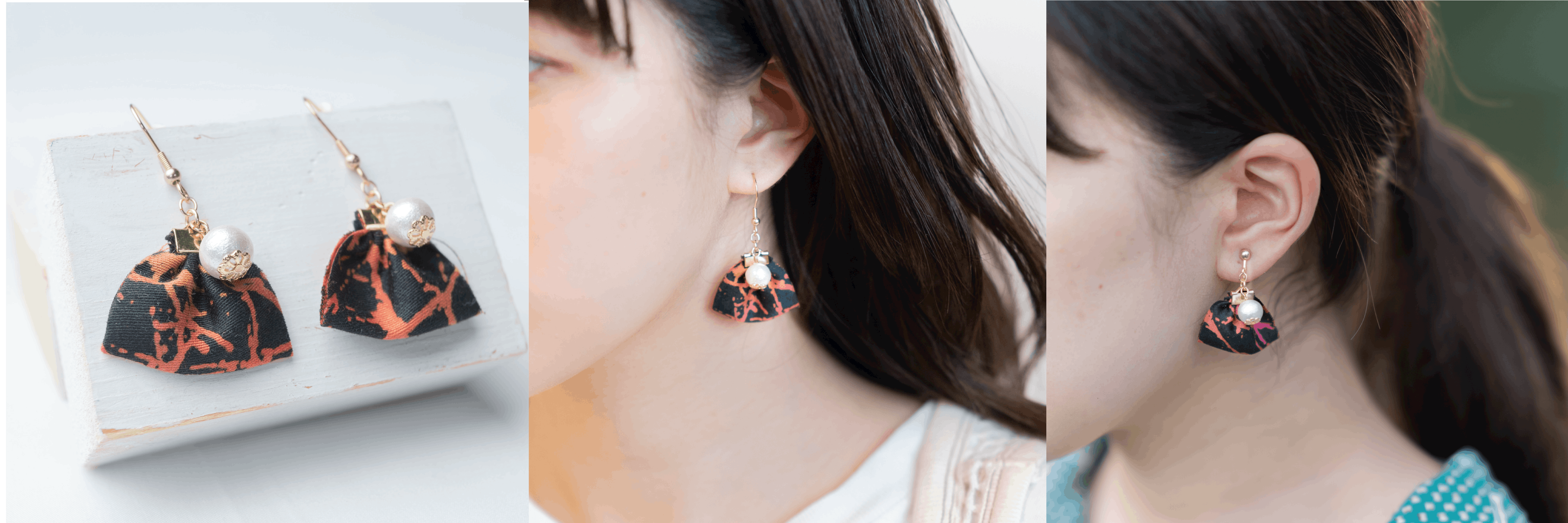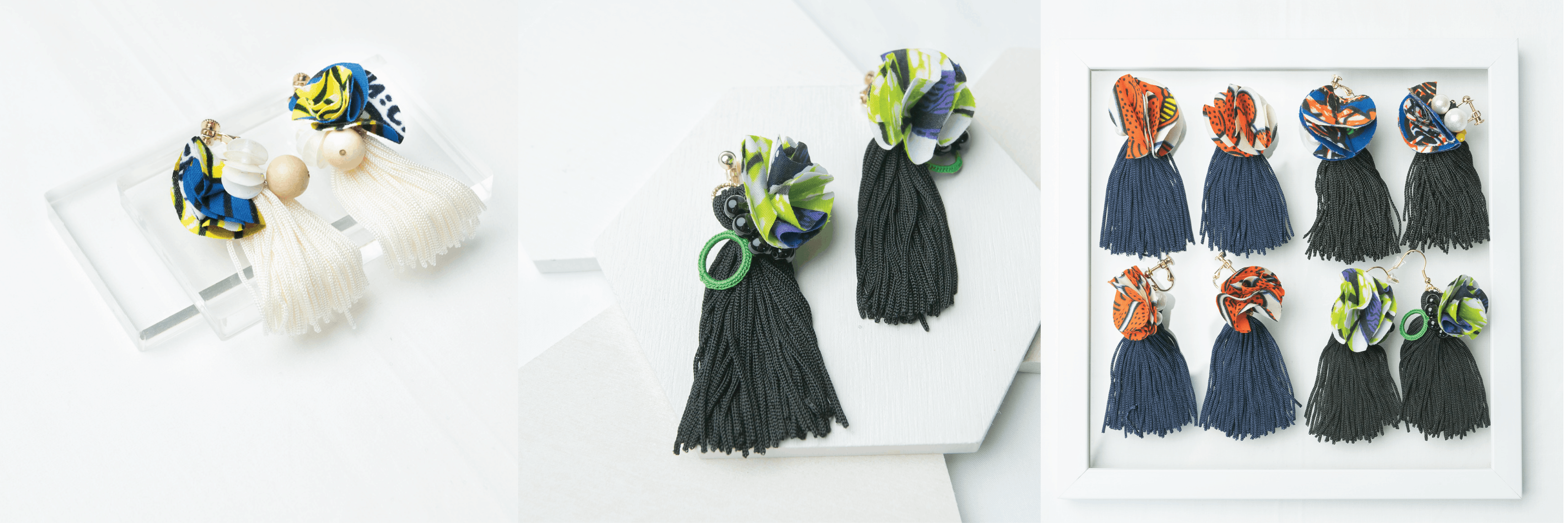 プロダクトリターンでは、以下のクロスデザイン・タッセルデザインのピアス/イヤリング、またカフスボタンをご用意しています。第一弾提供企業AFURIKA DOGS様の彩纈染め・ろうけつ染め・アフリカンバティックを使用。