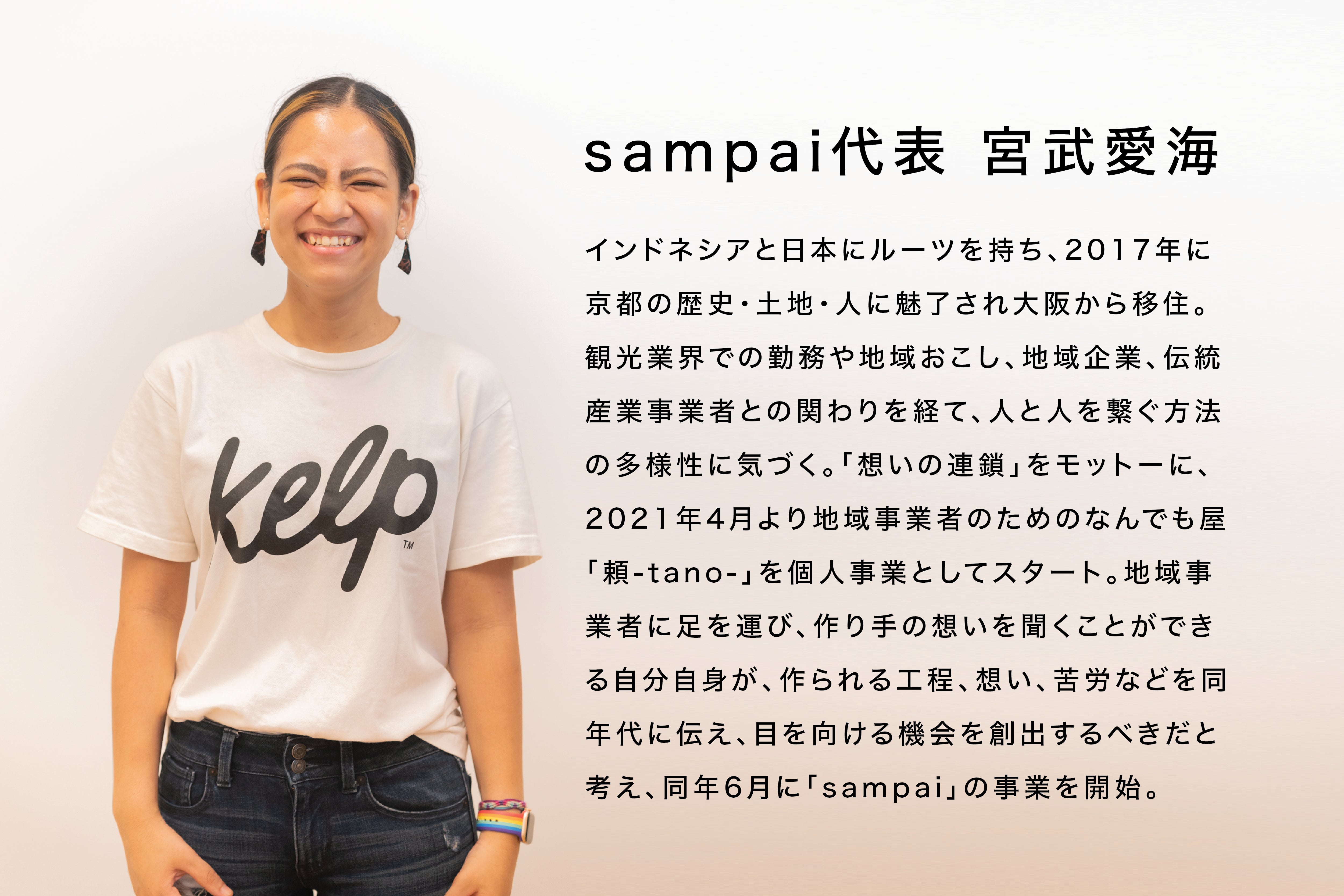 sampaiは、企業から出た産廃と個人を繋ぐ活動で、作り手である伝統産業や地域産業の可視化と若い世代へ「消費」や再利用によるクリエーションを考える機会、地域の企業が抱える社会課題や環境問題を「自分ごと」に捉える機会を創出します。