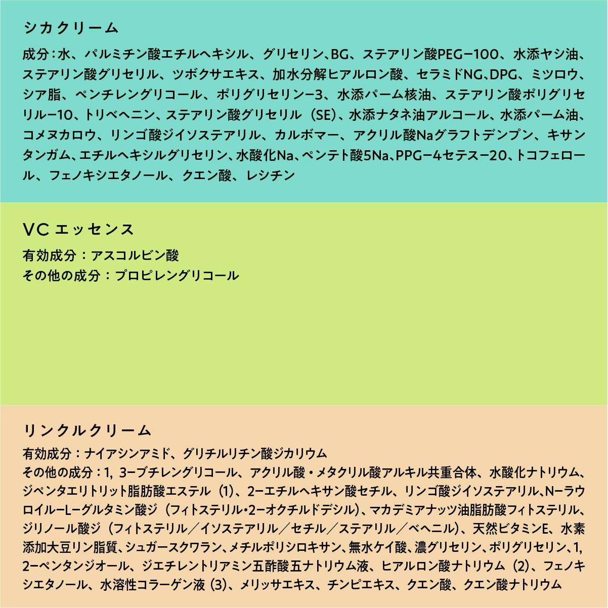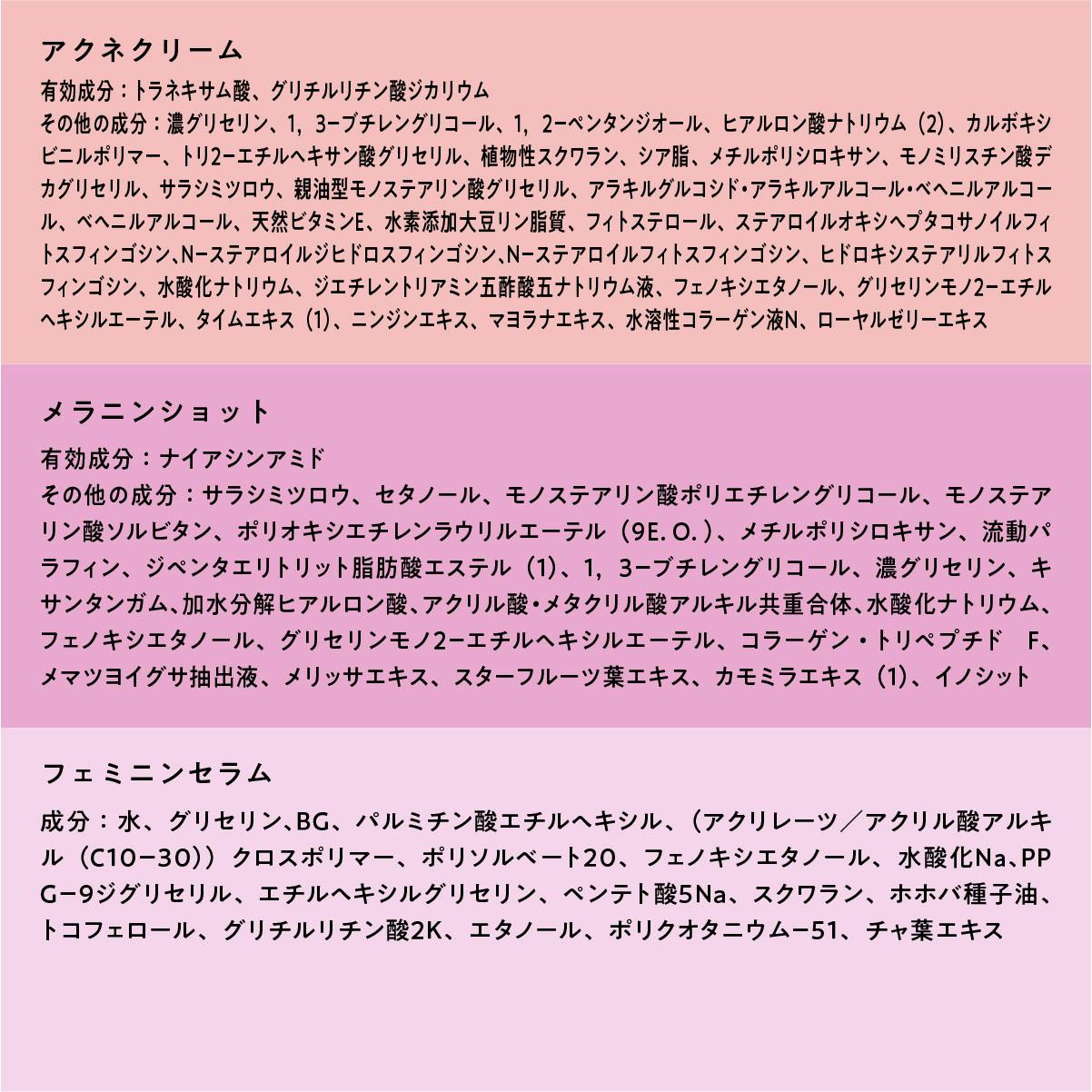 毛穴やキメには、純粋ビタミンC。シワにはナイアシンアミド。肌荒れには、ツボクサエキスやグリチルリチン酸2K。美白にはトラネキサム酸。