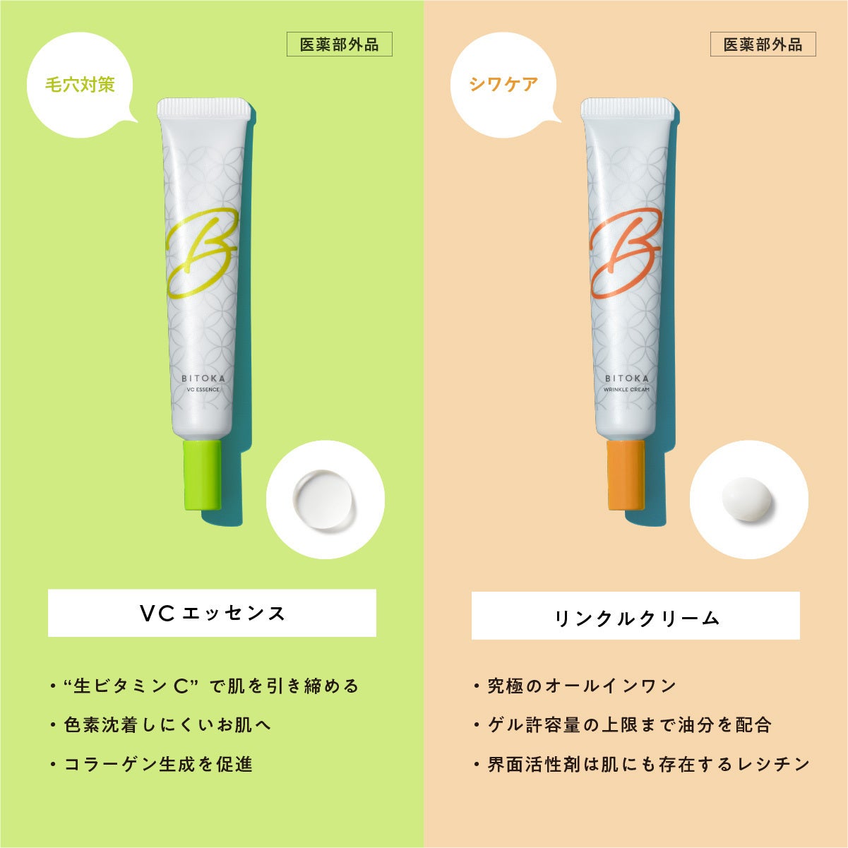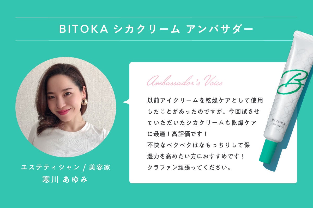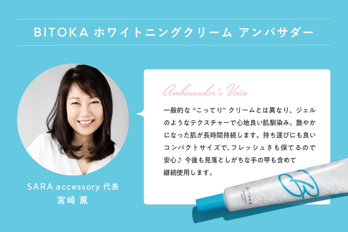 「今回の9種のシリーズは、日々のお肌の調子に応じてポイントケアができる非常に使い勝手が良いラインナップです。中でも私のお気に入りは、ビタミンCのエッセンスです。通常、化粧品ではビタミンC誘導体が使われることが多いのですが、『BITOKA VCエッセンス』は、純粋ビタミンC(アスコルビン酸)が有効成分としてクリーム内で安定した処方により、コラーゲンの生成を促したり、できてしまったメラミン色素を薄くしたり、色素沈着しにくいお肌に導きます。製品をお届けできるのが、ちょうど美白ケアや乾燥ケアにぴったりの12月のため、冬のスキンケアをお楽しみいただければ幸いです。 」
