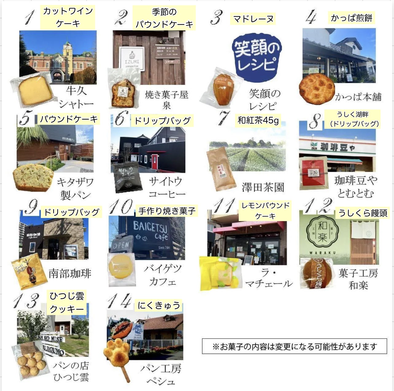 牛久のお店14店舗のスイーツとドリンクがひとつの箱に入ったコラボセット