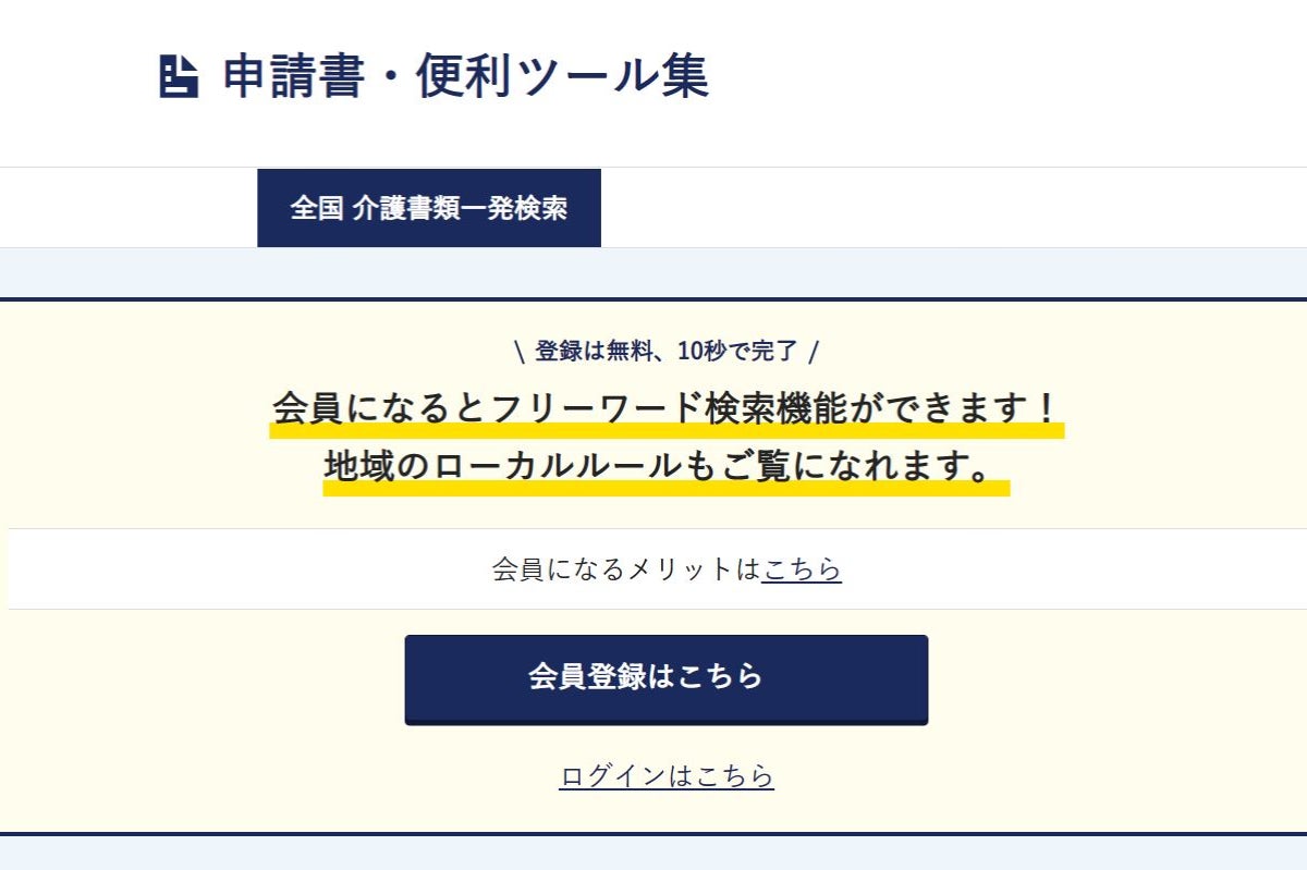 そこでサイトに《全国介護書類一発検索》という検索システムを作りました。これで介護申請書類のフォーマット探しという、介護業務とは関係のない不毛な時間を短縮することができます。
