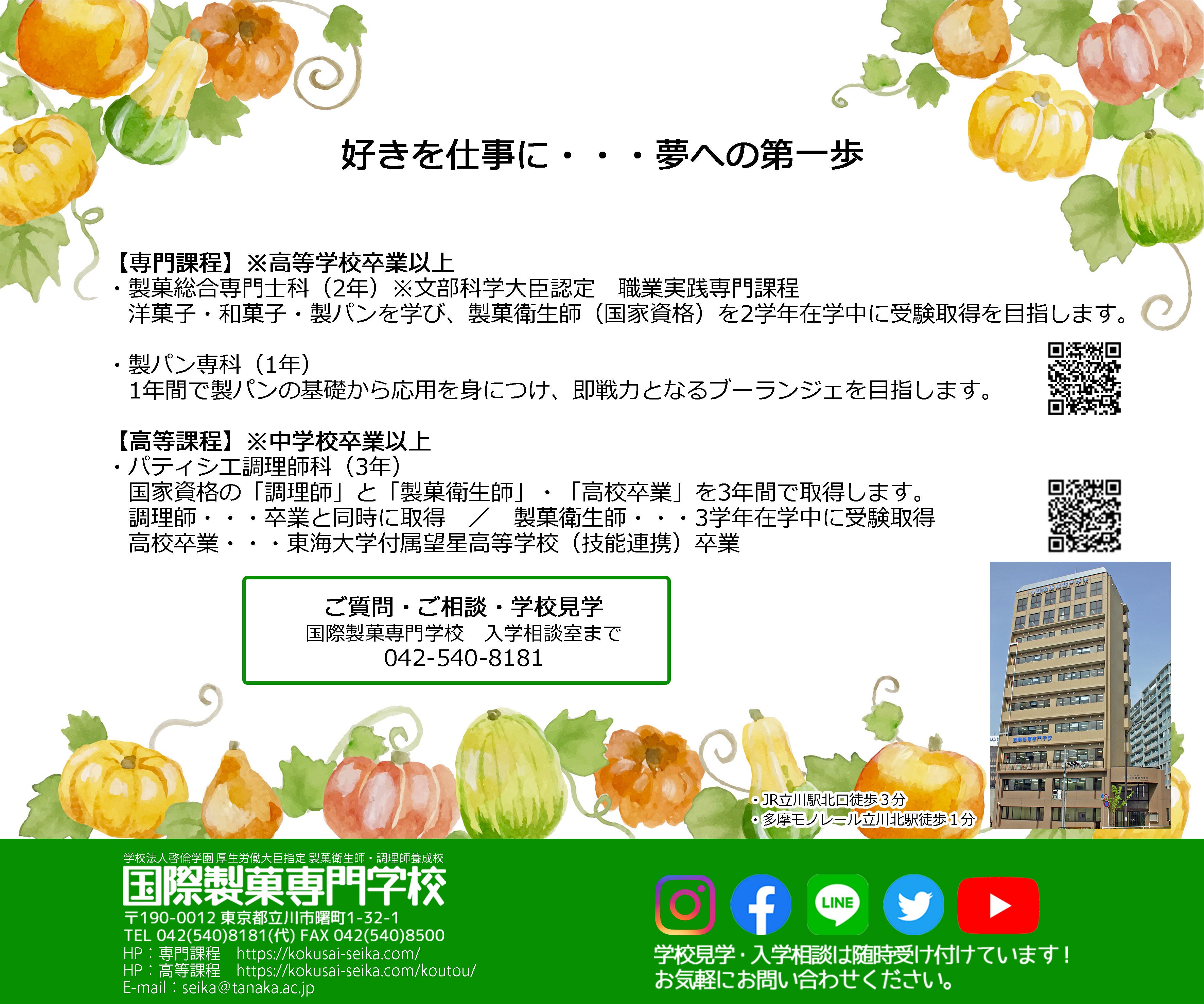 本日は学校のご紹介をさせていただきます。国際製菓専門学校は、JR中央線立川駅から歩いて数分のところにございます。2人が卒業したのは中学卒業後でも入学できる高等課程です。