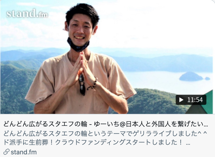 こんにちは。クラファンスタートから早くも3日がすぎました。拙いページにも関わらず応援してくださるみなさま、そしてご支援くださる皆さま、本当にありがとうございます!今回の挑戦は音声配信アプリ stand.fm の仲間でプロジェクトを組んで活動しているのですが、プロジェクトメンバー以外にも温かいスタエフ仲間のみなさまが、ご自身の配信チャンネルで応援してくださっています!本当に嬉しいです!!こちらでは、クラウドファンディングを応援してくださっているスタエフパーソナリティさんをご紹介させていただきたいと思います。どんどん広がるスタエフの輪https://stand.fm/episodes/6153a5cfecd7220006adb2c6パーソナリティのゆーいちさんは、日本語教師として日本に住む海外の方に日本語を教えるだけでなく、コロナ以前はリアルに京都のカフェで国際交流のイベントを、コロナ禍においてはzoomで世界と繋いで国際交流イベント「OUCHI de International」を主宰されています。その他にも、タイ語でYouTubeチャンネルを運営したり、日英noteという日本語と英語で様々な気づきをみなさまに伝えてくださったり、noteにビジネススキルアップのための記事を書いてくださったりと「いつ寝ているんだろう?」と思わんばかりの活動ぶり。いつも学びを忘れない方です。あかさんも、昨年12月にスタエフで知り合ってから、こちらの「OUCHI de International」に参加させていただき、全く英語がしゃべれないながらも日本語の上手な海外の方にも助けていただきながら、楽しい時間を過ごさせていただいております。今回は、早速ご自身のライブでご紹介くださいました!ありがとうございます!そしてゆーいちさんには、ド派手に生前葬!の特設サイト内の文章の英語訳にもご協力いただきました。スタエフから海外へ、まさしく今回のチャレンジに相応しい繋がりを作ってくださった方の一人です。ぜひみなさまも、配信をお聞きになってみてくださいね!*******************************チャンネル名ゆーいち@日本人と外国人を繋げたいチャンネルURLhttps://stand.fm/channels/5f5c2468f04555115d3269b3*******************************