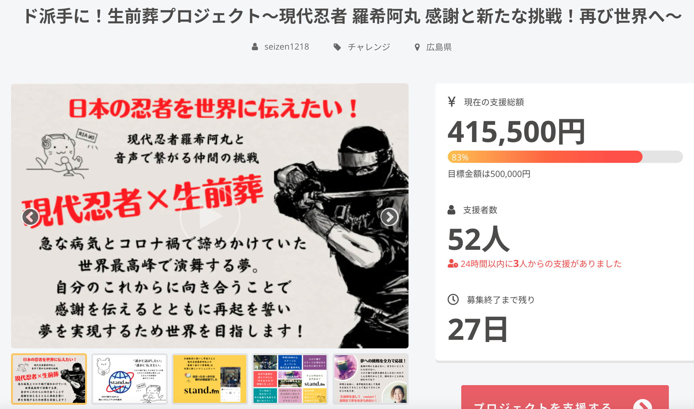 目標を達成いたしました!ありがとうございます!この度のクラウドファンディングでは、実行委員会メンバーの予想をも上回る勢いでご支援を賜り感謝の気持ちでいっぱいです。9月28日にスタートしましたが、多くの方にご支援をいただきまして10月18日現在、73名の方から504,500円のご支援をいただき、目標金額の500,000円を達成いたしました!10月18日の達成直後に羅希阿丸さんとお礼ライブをさせていただきました。         ↓ ↓ ↓ ↓ ↓ ↓ ↓ ↓ https://stand.fm/episodes/616ea1c10052ab000776c8e4初めての挑戦、手探りでリターンの設定ではみなさまにご迷惑をおかけするような所もあり不安でいっぱいでしたが、stand.fm 仲間が多く関わってくださったり、その他のSNSでも多くの方がリツイートや拡散をしてくださって、SNSの力を感じるチャレンジとなりました。残り10日!ネクストゴールに向かってチャレンジ!今回のチャレンジは10月30日までとなっており、残り10日を残しております。今回は500,000円と設定しておりましたが、ネクストゴールに向かって残り10日もチャレンジを続けていくこととなりました。今回ド派手に生前葬!では12月18日に現代忍者羅希阿丸さんの「生前葬」を行います。第1部はNPO法人エンディングノート普及協会を中心として、葬儀のプロが関わり模擬葬儀を行います。模擬葬儀では、皆さんが実際に行われる葬儀では見ることのできない裏側や準備の様子など「現代の葬儀とは?」を考える時間となるよう準備を進めております。第1部では、今回のド派手に生前葬!を行う繋がりを作ってくださった、浄土真宗本願寺派の桜山寺正向寺の櫻井御住職にもご参加いただきます。また2部では、ド派手に生前葬!プロジェクト実行委員会が中心となって、羅希阿丸さんと演舞仲間による演舞他、羅希阿丸さんがこれまで生きてきた中での感謝の気持ちをお伝えしたり「もう一度、現代忍者として世界を目指します!」という宣言なども予定されております。ネクストゴールにチャレンジさせていただくことに関しましては、改めて支援してくださった皆様にもお伝えしてまいりますので、しばしお時間をくださいませ。まずは目標達成ありがとうございます!の感謝とお礼のご報告をさせていただきました。10月30日まで、そして12月18日のド派手に生前葬!当日まで、引き続きよろしくお願いいたします。