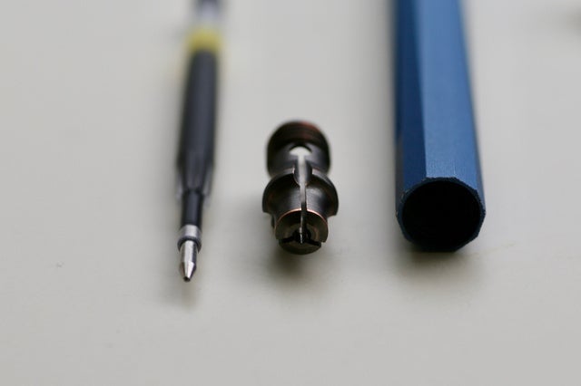 ボールペンCの構造はシンプルで使い方はとっても簡単です。マグネット式のキャップを装着したまま回転させて、口金に当たるパーツのスリット(チャック)にボールペン芯を差し込むようにして装着します。