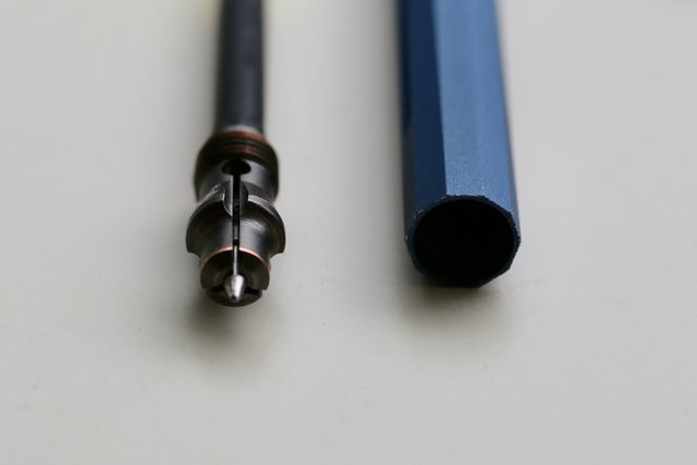万力のようにしっかりとボールペン芯の先端を挟み込むような構造を採用。様々なリフィールの使用を可能にしました。
