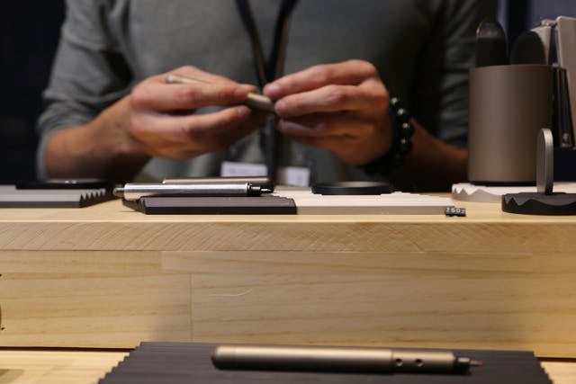 そんな中、スタイリッシュでどことなくヨーロッパな雰囲気のANTOUの人気はひときわ目を引きました。 ブースに立ち寄りBall-Pen Cを手に取りながら商品説明を受け、メーカーやブランドに関係なく”様々なボールペン芯を使える”という今までにない発想もさることながら・・・