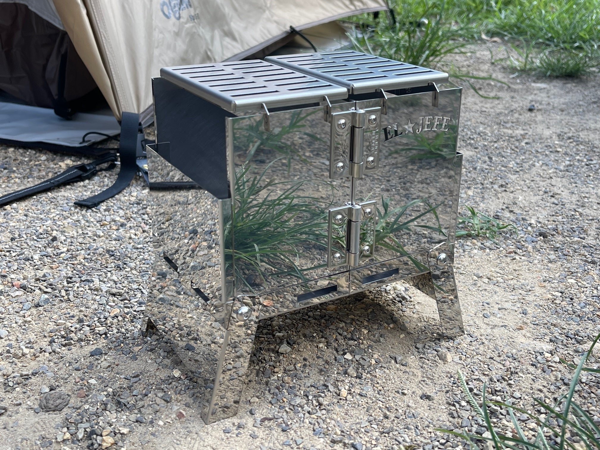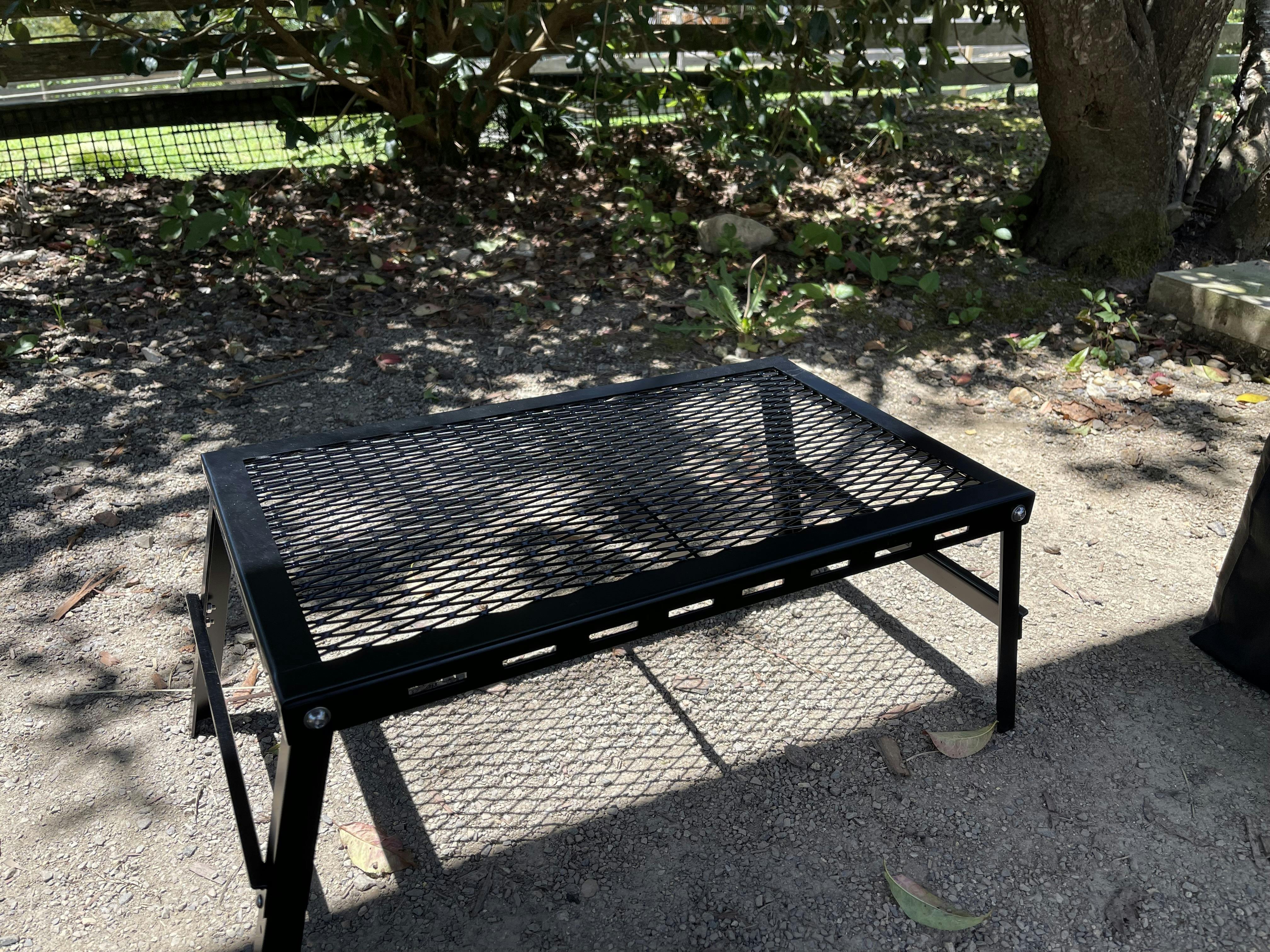 しかもこの受け台、キャンプ場に到着したら「アイアンメッシュテーブル」になるのです。実は折りたたみ式の足が着いているのです(その分受け台としても頑丈になっているのです)。