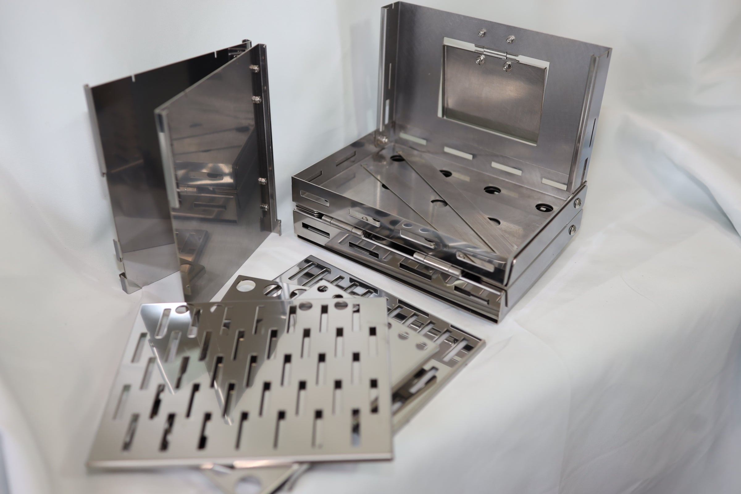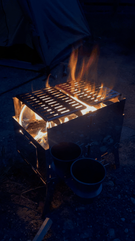 折りたたんでポケットに入るサイズの焚火台です。ロストル、ゴトク、焼き網付き(板厚1.5mm)。