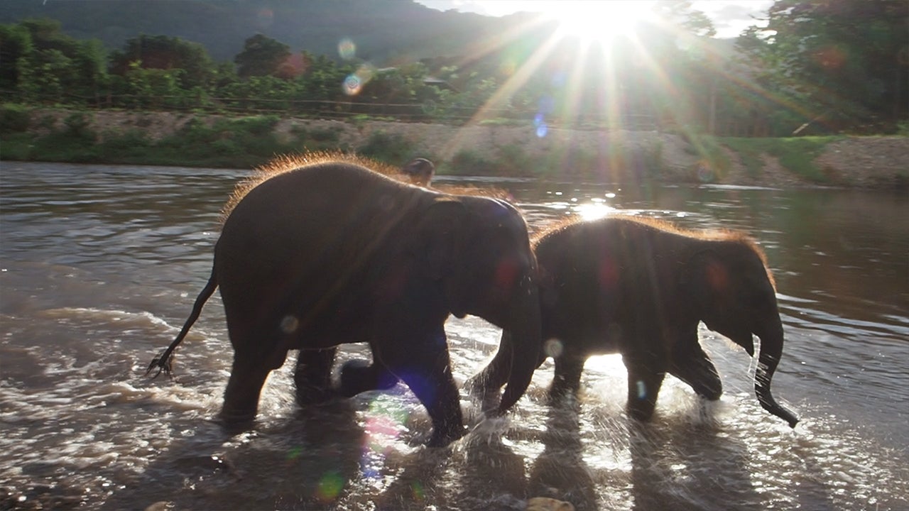撮影報告です。子象ワンマイファミリー3頭とピーマイファミリー3頭が合体して6頭の群れを作りました。それぞれお母さん象と乳母と子象のの2ファミリーが合体したんです。まだ、完全に群れになったわけではないですが、今、お互いをもっと知る期間です。群れで一緒に行動します。移動も子象を中心に親象たちが囲み守ります。一旦、子象が助けての声を出したものなら、、母親、乳母が鼻を地面に打ち付けて周りを威嚇します。そして、子象を囲んで円陣を組みます。そばにいたらとても危険です。子象と接する時は気をつけないといけないのです。夕暮れになって群れで川遊びを楽しみました。奥野安彦