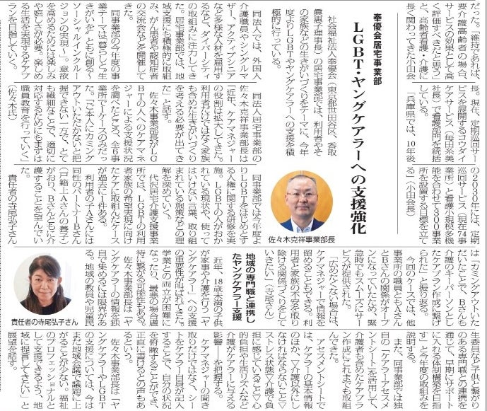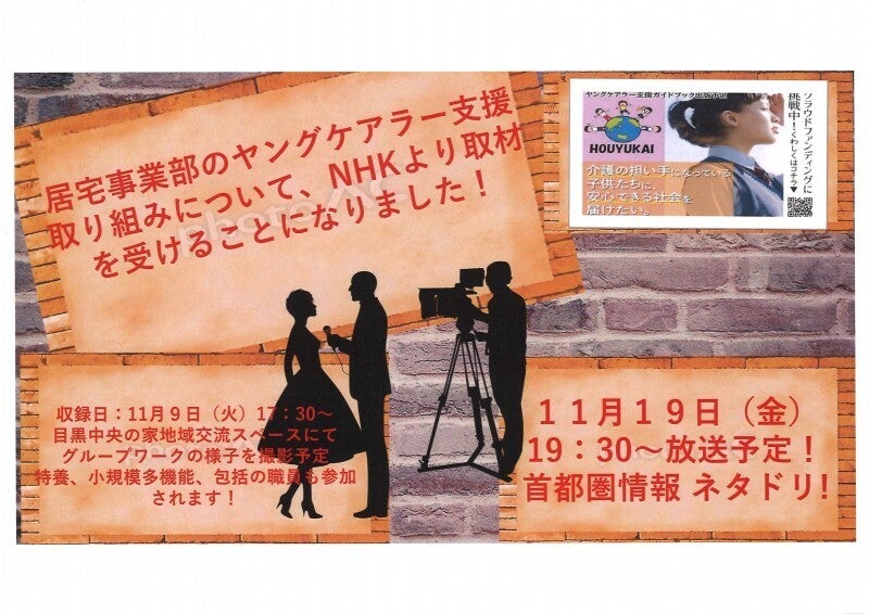 居宅事業部のヤングケアラー支援の取り組みについて、NHK首都圏局様のご依頼により、先日、取材を2日間に渡りお受けいたしました。取材された内容につきましては、以下の番組で放送される予定です!11月19日(金)19:30~20:00迄 NHK首都圏局「首都圏情報ネタドリ」放映予定です!(ヤングケアラー支援特集)◎出演者松田利仁亜氏(NHKアナウンサー)高橋みなみ氏(元AKB48)岡田結実氏(タレント)是非、ご視聴ください!さらに、ヤングケアラー支援ガイドブックの企業スポンサーになれる権利やガイドブックに企業スポンサーとして企業名とQRコードを掲載させていただきます。あなたの企業名をヤングケアラー支援ガイドブックでPRする事もできます。また、ヤングケアラーに取り組む『教育・福祉関係者』だけではなく、企業・法人・団体様へ向けたワークショップや説明会を設けさせて頂きました。企業・法人様に限らず、一般団体でのご支援も可能です!引き続き応援よろしくお願いいたします!!