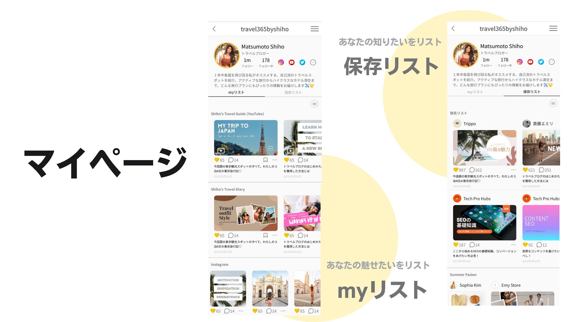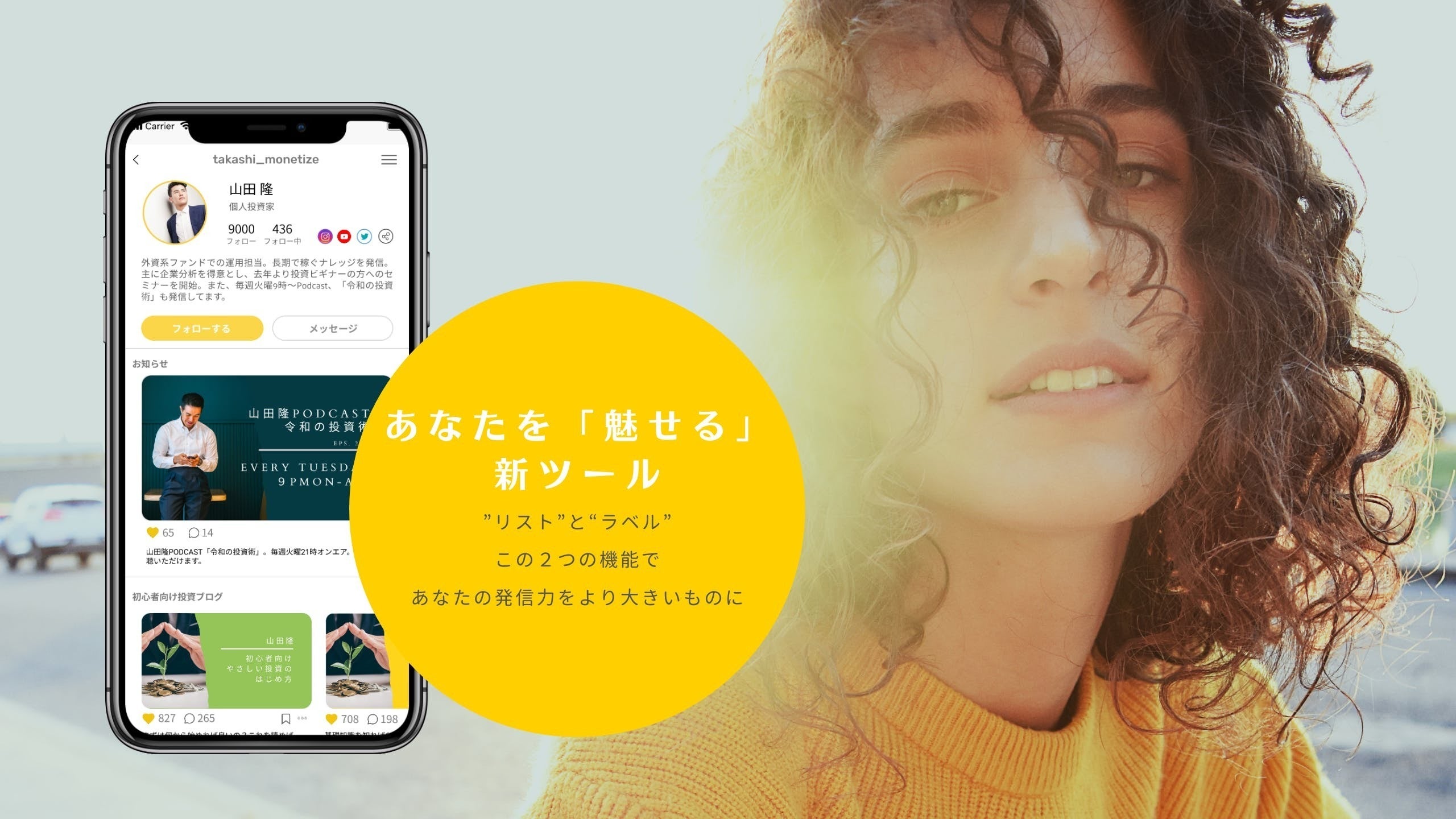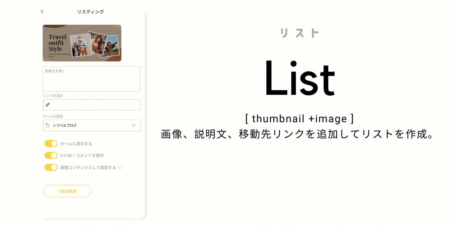 Instagram、YouTube、ブログ記事、ホームページなど、あなたの発信したページのURLとサムネイル(画像)を紐付け、あなたのプロフィールにリスティング!活動を分類ごとにラベル分けできるので、閲覧者にも「あなた」がすぐ伝わる!