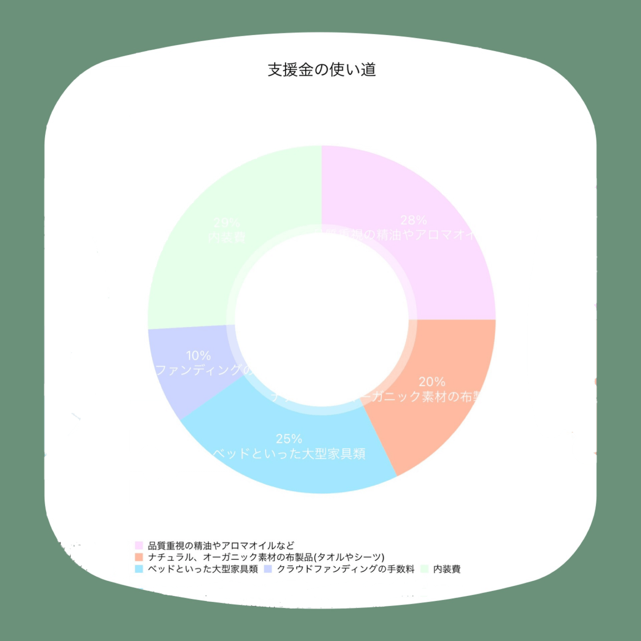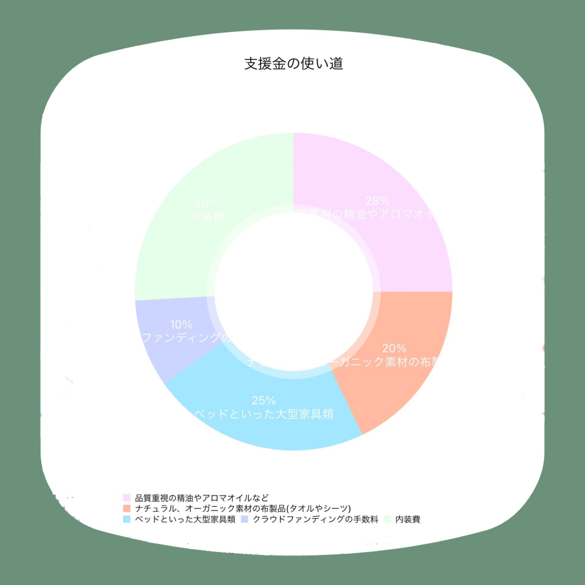 皆様からご支援頂きました資金は、サロンの内装費、精油、オーガニックオイル、施術台、オーガニックのタオルやベッドタオル、0からの準備とし、また一部、CAMPFIREクラウドファンディングに関する決済手数料などの支払いを含むもの。