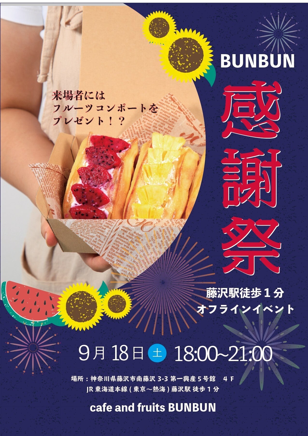 店長の吉田です!9/15現在、皆様のおかげで支援者数が大台の100名となりました!!心より感謝しております!支援金額については達成率78%まできており、「あと25日で約20万円」とゴールが見えてきました!店舗工事も来月オープンに向けて順調に進んでおります。良かったらTwitter、Instagram更新してますのでチェックして下さい!オープン日が決定し次第、ご報告させていただきますのでよろしくお願いいたします!*イベントのお知らせ*BUNBUN感謝祭日時:9/18(土)18:00~21:00場所:295 シェアスペcool藤沢(藤沢駅徒歩1分!) 神奈川県藤沢市南藤沢3-3 第一興産5号館 4F来場者には、ミニサイズのフルーツコンポートをプレゼント!ぜひ食べた感想を聞かせて下さい!※感染症対策のため、入場制限をする場合がございます。※アルコール消毒とマスクの着用をお願いします。毎週水曜日 20:00生配信TwitterかInstagramで毎週生配信中!15日はInstagramでの生配信です。お楽しみに!