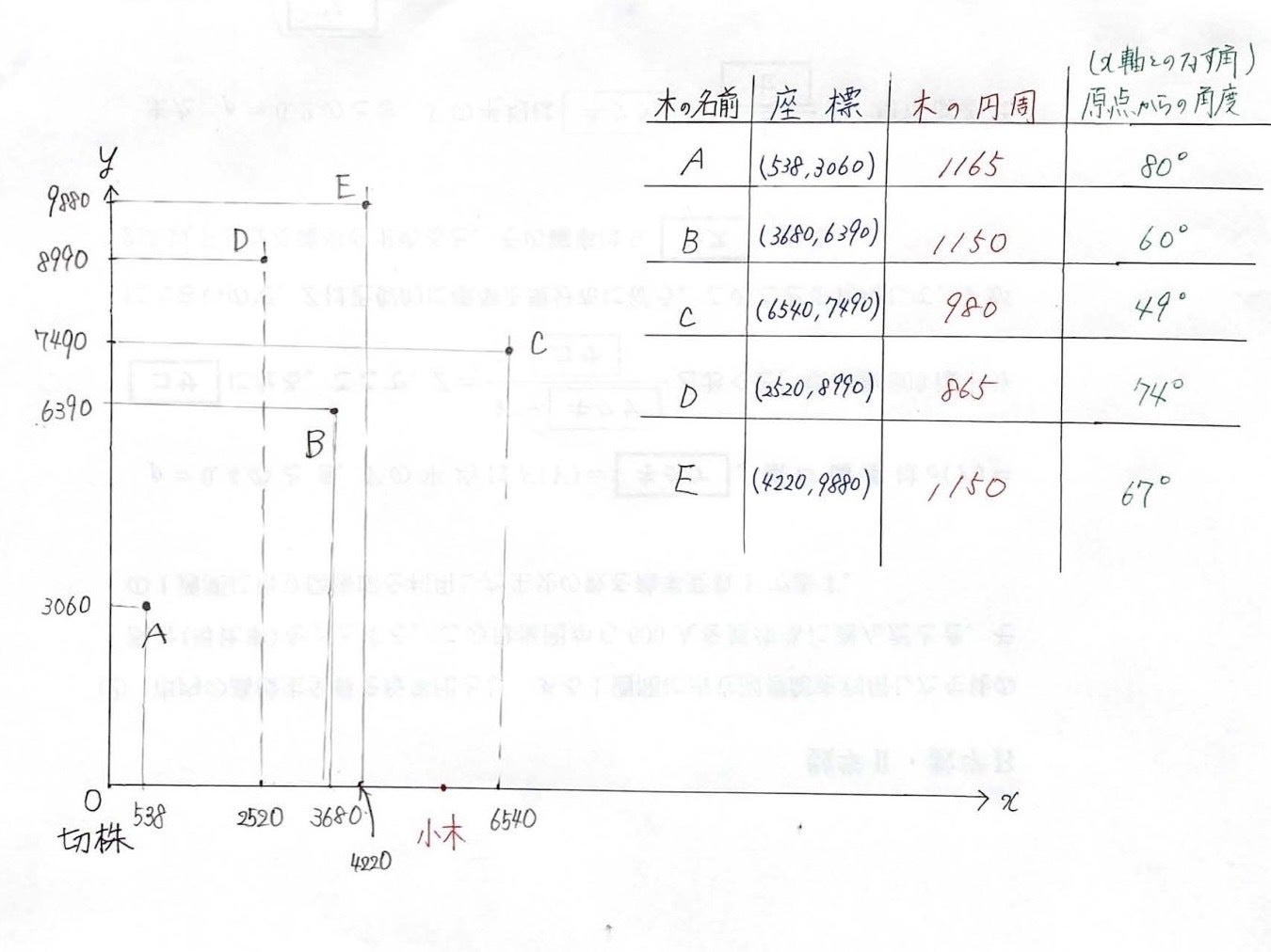 (教育学部の数学専攻の大学生が木の配置を計算で出してくれました。)