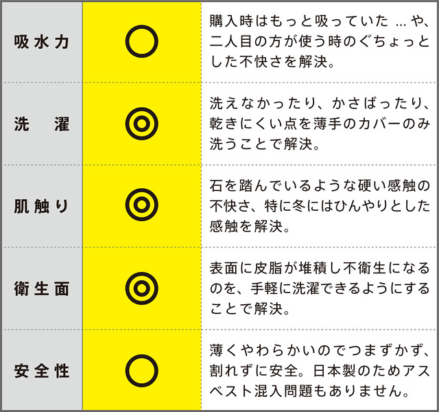 カバー素材には吸水性が高く、しかも上質な踏み心地を兼ね備えている厳しい仕様にこだわりました。