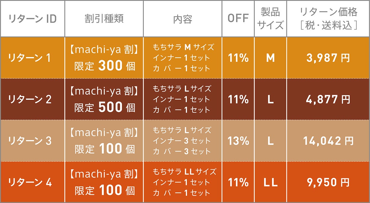 ご支援いただきますお礼に、「もちサラ」完成品をリターンとしてお届けいたします。 Lサイズに限りさらにお得な3セット組もございます。 数量限定ですので、是非お早めのご支援をご検討いただければ幸いです。