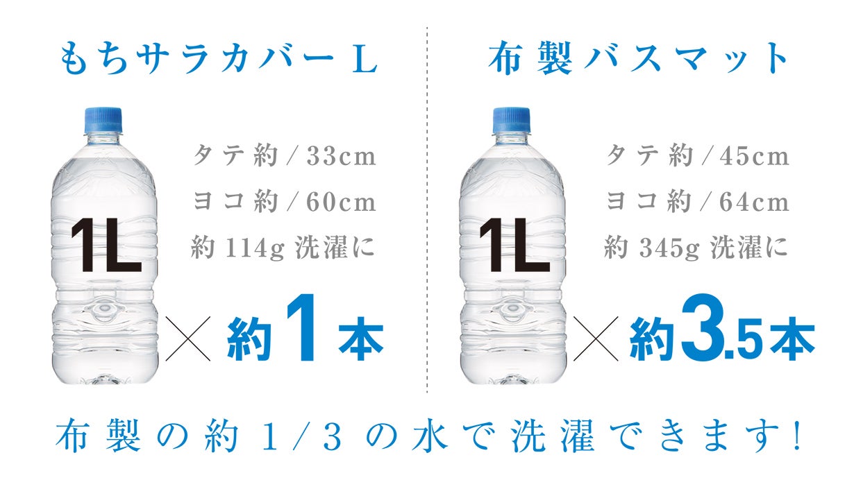 洗濯の際、一般的には洗濯物の重さの10倍以上の水が必要と言われていますが、「もちサラ」はバスマット全体ではなく、カバーだけを洗濯すれば良いため軽く、節水につながります。薄手で他の洗濯物と一緒に洗えるので、さらに経済的。洗濯槽や干す時にもかさばりません。