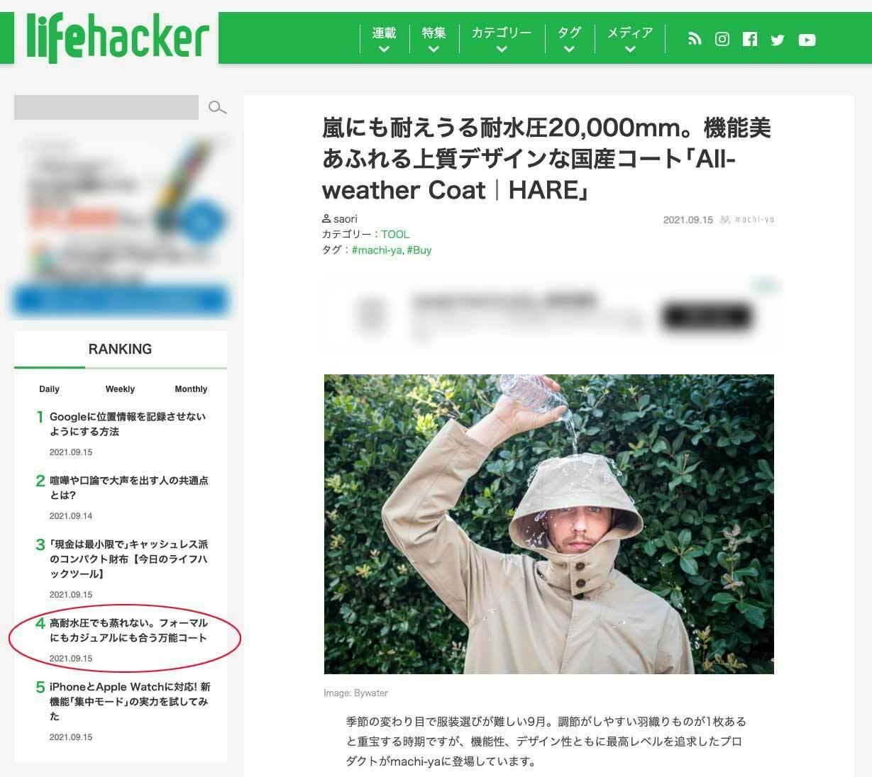昨日、『lifehacker[日本版]』に「All-weather Coat|HARE」の記事が掲載され、本日Dailyランキング4位にランクインしているのを確認しました。(たまたま確認した時は4位でしたが、現在はランク外でしたので、もっと上のランクのタイミングもあった可能性もございます。)