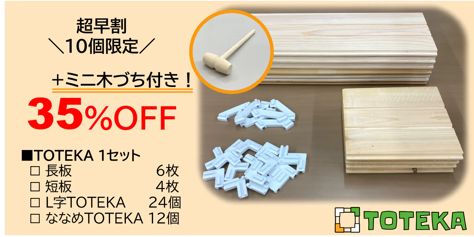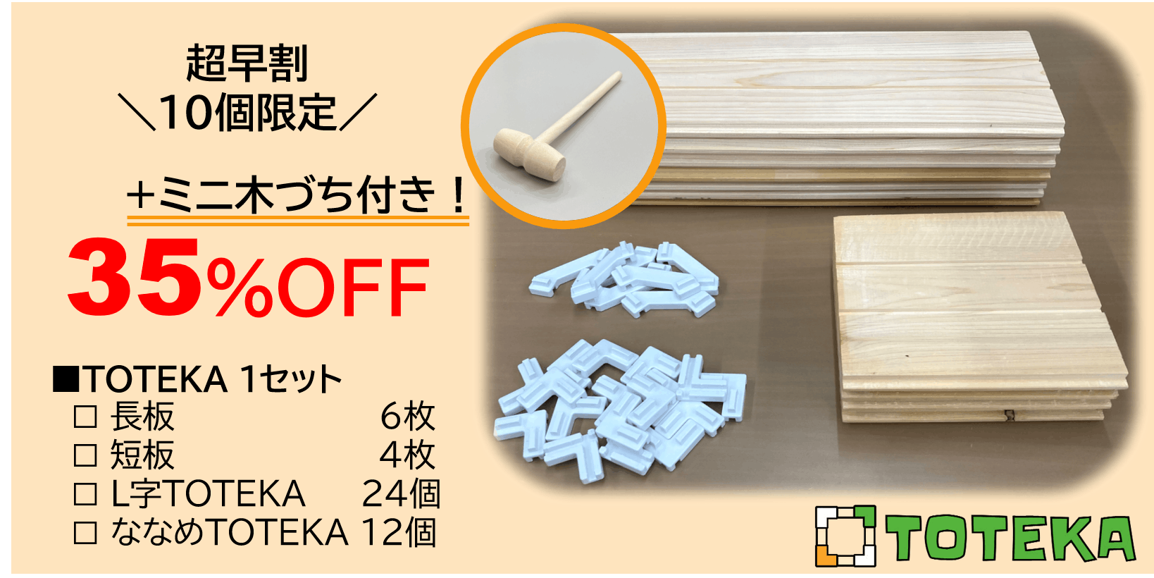 TOTEKA 1セットに、ミニ木づちをつけてお届けします。
