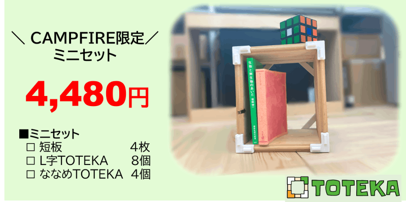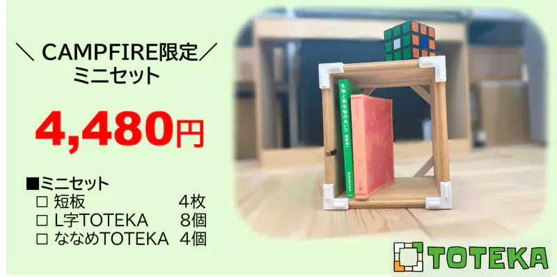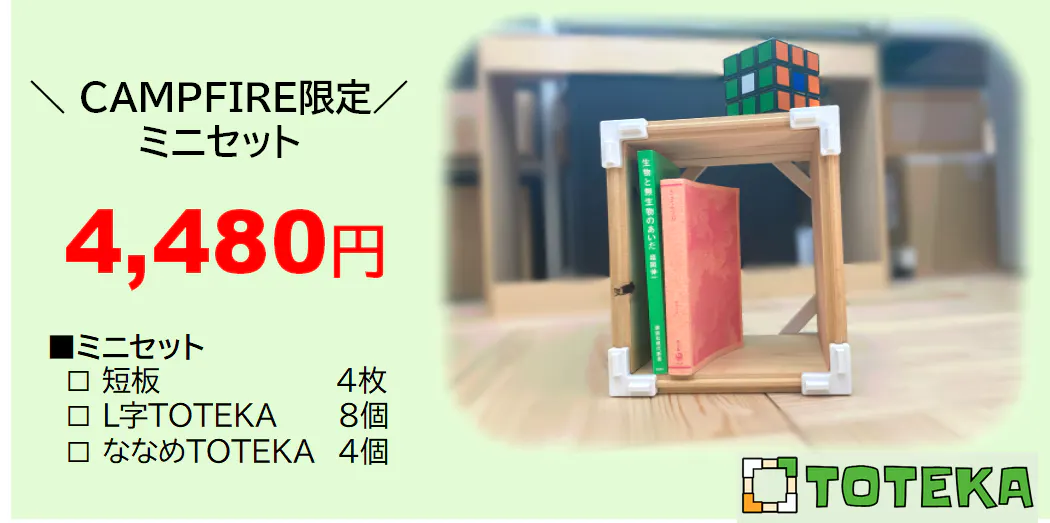 2021/11/10 16:07みなさま、こんにちは。これまでリターンはTOTEKA 1セットのみの設定でしたが、 「ちょっと試してみたい」 「もう少し気軽に手に入れたい」 「コンパクトなものが欲しい」といったお声にお応えして、新たに CAMPFIRE限定のミニセットをご用意いたしました!板4枚、TOTEKAパーツ12個というシンプルな構成で、お値段も若干抑え目になっております。組み立てると、ちょうど漫画や新書が入るコンパクトサイズです。ちょっとした小物置きにいかがでしょうか。 小さくなっても無垢ヒノキの魅力とTOTEKAの楽しさはたっぷりお伝えできます!サイズや価格が気になっていたみなさま、ぜひ【TOTEKA ミニセット】をご検討ください!セット内容 ■無垢ヒノキ板 □短板(18×15×1.5cm)4枚 ■TOTEKAパーツ □L字TOTEKA 8個 □ななめTOTEKA 4個 ■取扱説明書 1冊※ 写真ではTOTEKAパーツは白1色ですが、実際は3色になります。※ お届けは2021年12月中旬を予定しています。※消費税、送料込み もっと見る