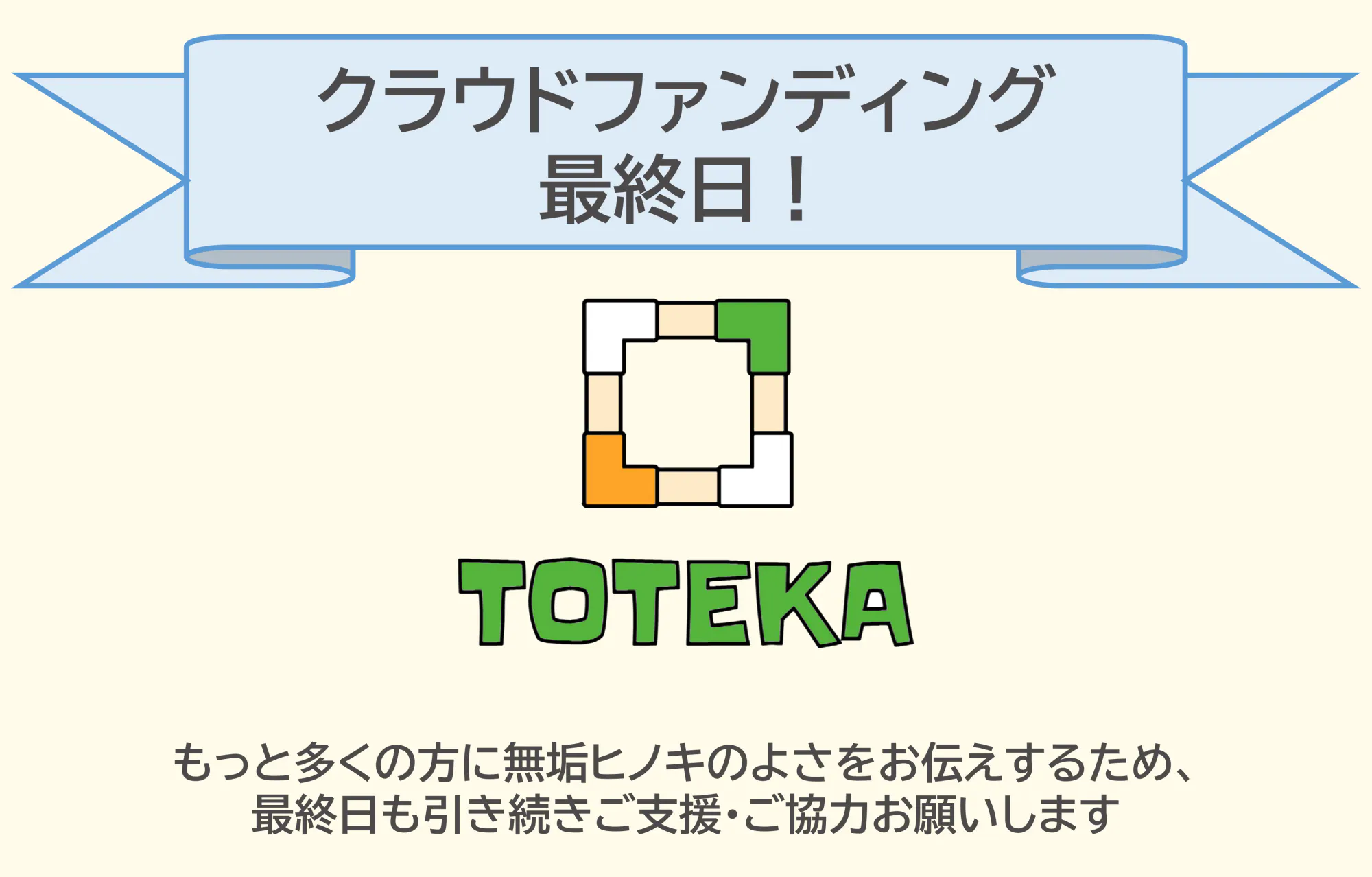 2021/11/30 08:26皆さま、おはようございます。私たちのプロジェクトもついにクラウドファンディング最終日を迎えました。これまでご支援いただいた皆さま、本当にありがとうございます。先日、あるイベントでTOTEKAワークショップを開催したところ、大変多くの方に楽しんでいただくことができました。アンケートを実施したところ、香りや手触りについて無垢のヒノキの良さも十分感じていただけました。みんなでワイワイ、ひとりでじっくり、大人でも子供でもいろんな楽しみ方がある木の棚おもちゃです。できる限り多くの皆さまに無垢の木とTOTEKAの良さを知って頂きたいと思っております。拡散にご協力、そしてご支援のほど、最終日もどうぞよろしくお願いいたします! もっと見る