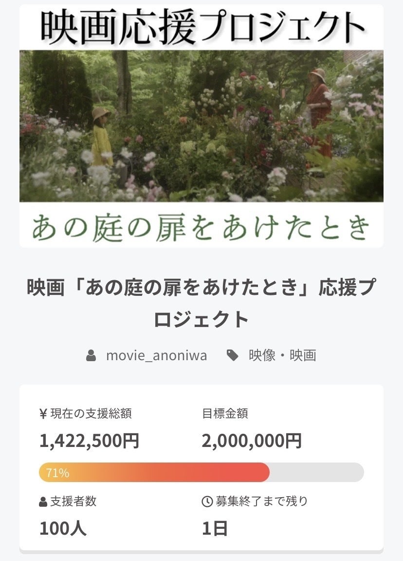 こんにちは。映画「あの庭の扉をあけたとき」スタッフです。本プロジェクト最終日・・・目標達成いたしました!ありがとうございます!本プロジェクトは目標達成しないと実行されないものでした。目標達成しましたので、無事リターンを実行することができます!ご支援いただいた皆様ありがとうございました!ですが、まだまだ12月19日日本最速上映となる映画祭AkibaScreening2021での先行プレミア上映チケットはあまっています・・12月19日(日)10時00分~秋葉原UDXシアター加藤柚凪、坂川陽香、蜂須賀健太郎監督登壇”映画祭AkibaScreening2021プレミア上映ご招待”と記載のあるリターンが該当となります。最後まで応援宜しくお願い致します!