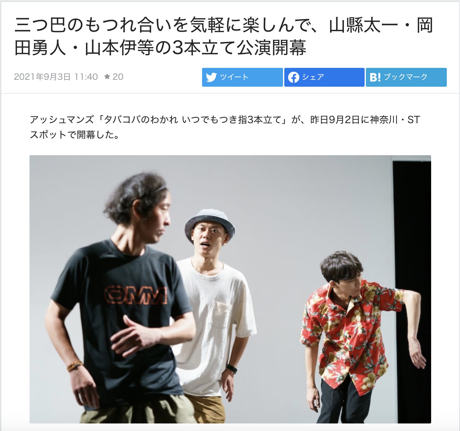 山本伊等が出演、劇作、演出をしている、オフィスマウンテンの山縣太一、岡田勇人とのユニット「アッシュマンズ」のオムニバス公演『タバコバのわかれ いつでもつき指3本立て』をステージナタリー様にてご紹介いただきました!