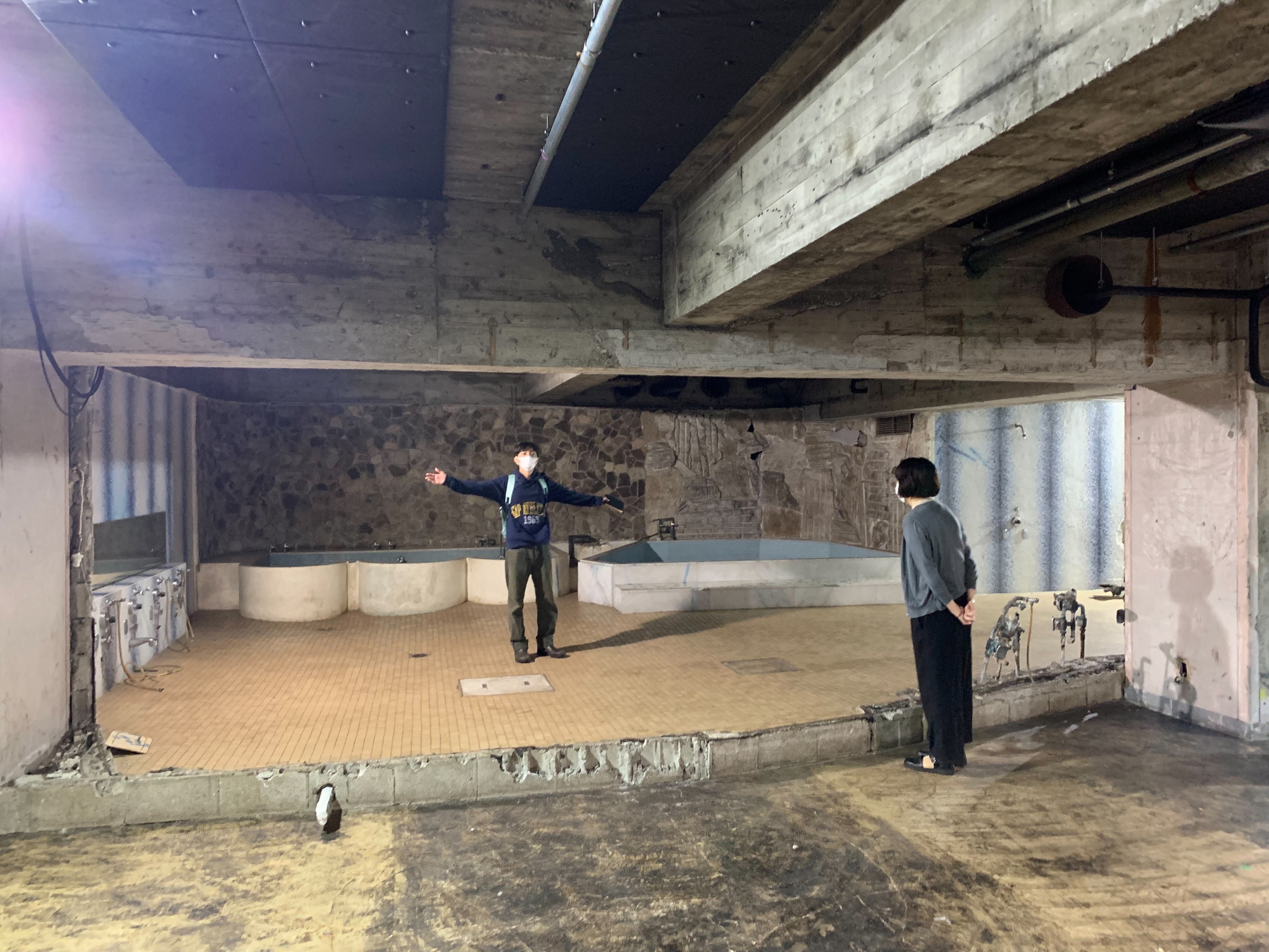 会場となる地下はステージや客席が自由に組める分、真ん中に柱があったり、銭湯のシャワーや風呂が残っていたりと制約も多いです。