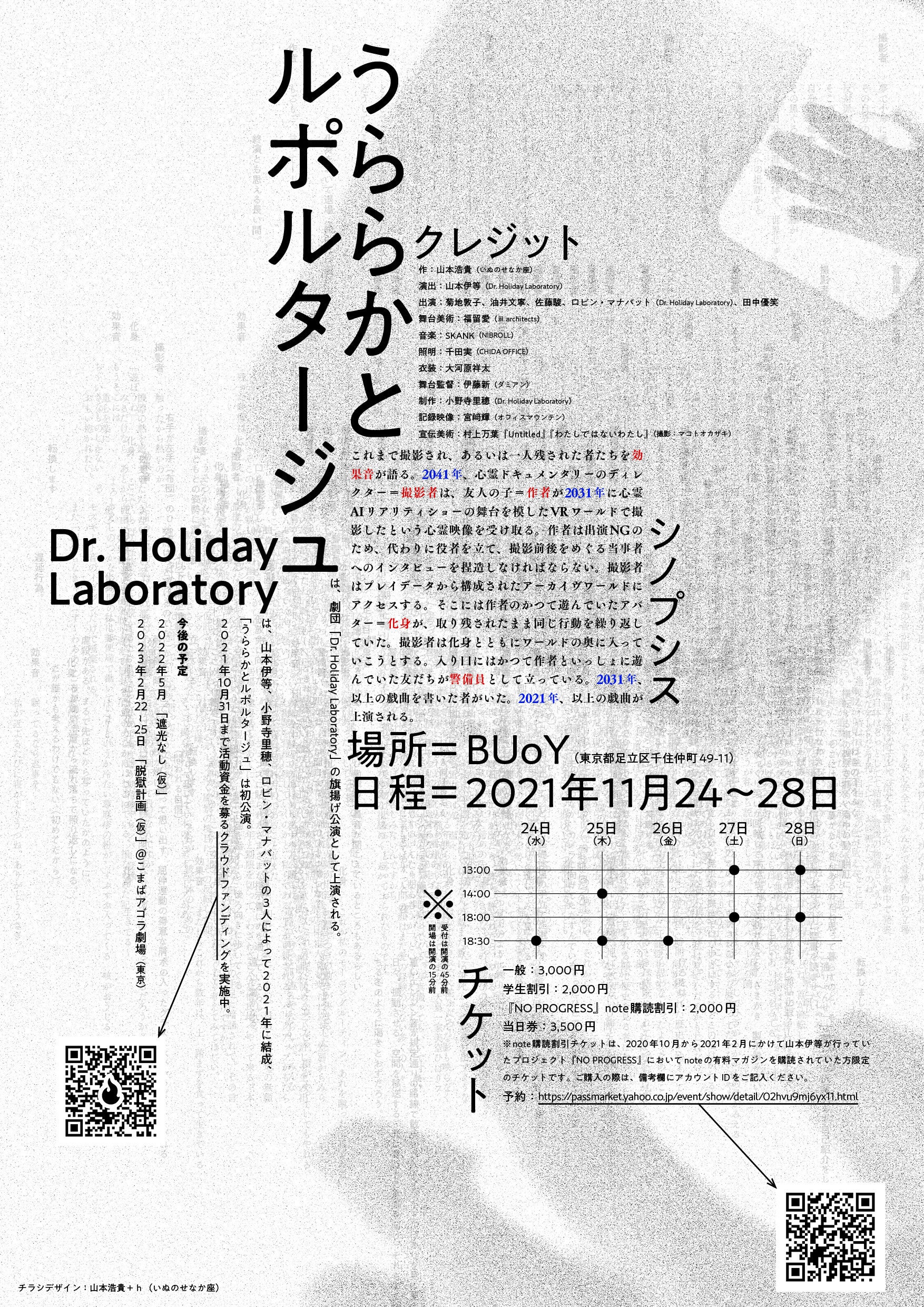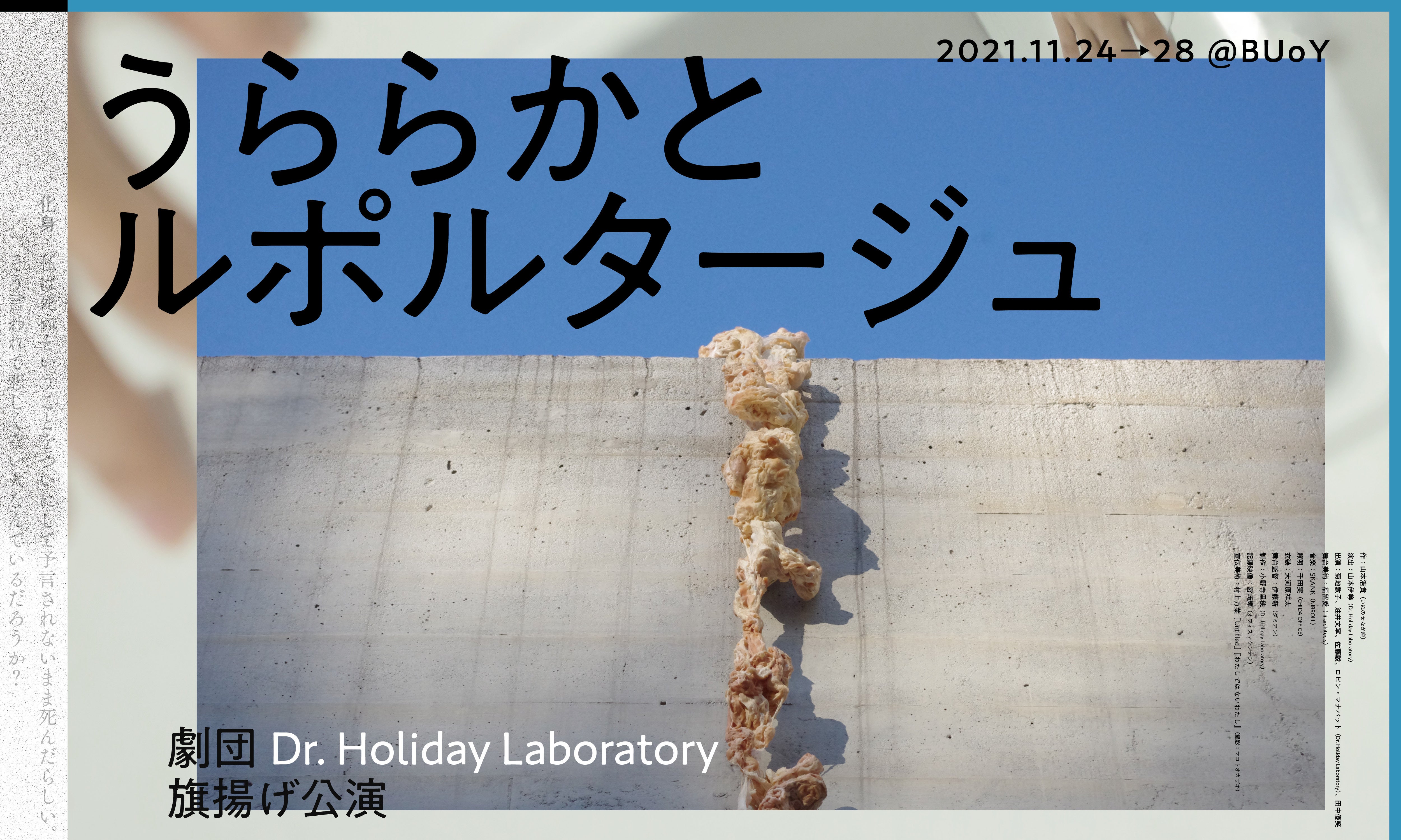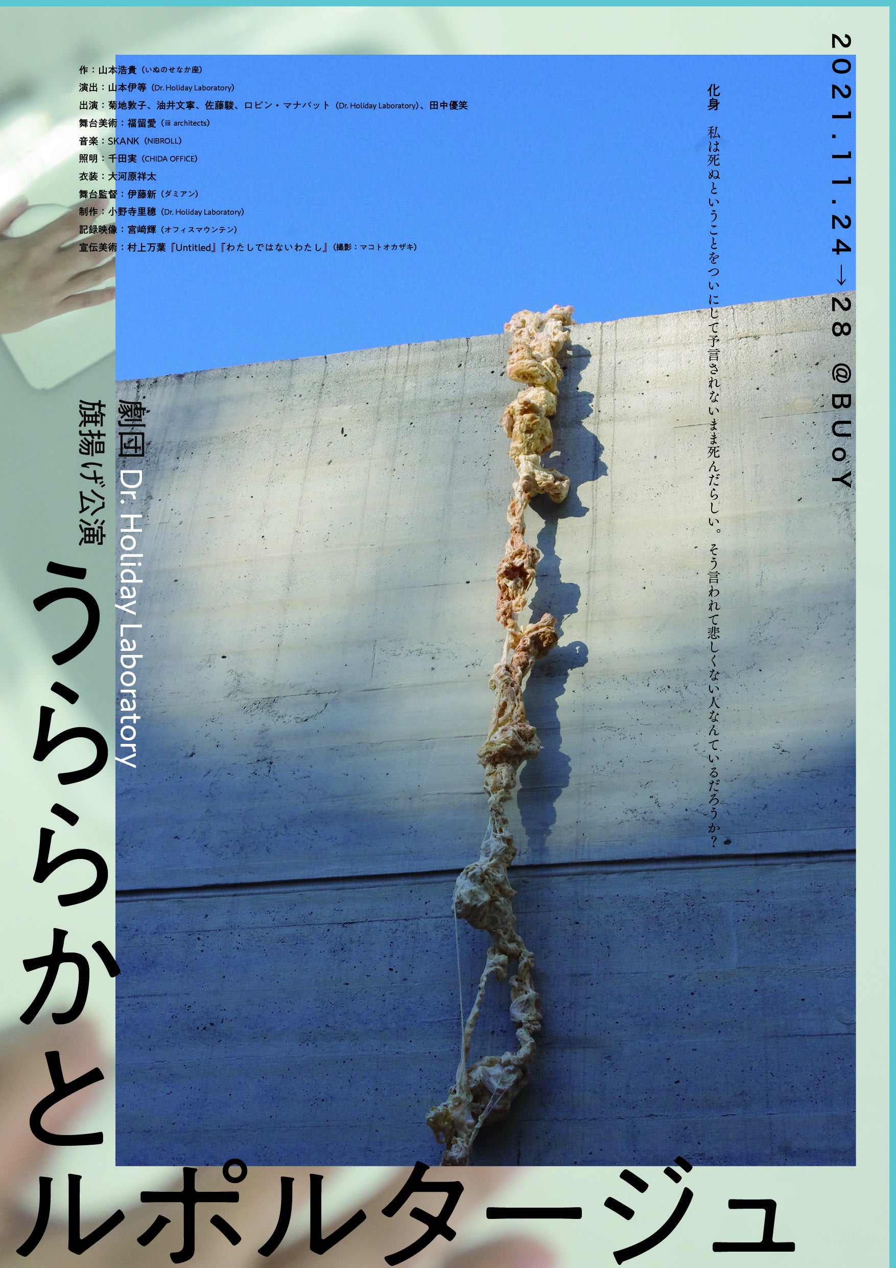 デザインはいぬのせなか座主宰で、今回劇作をしていただく山本浩貴さん、ビジュアルに使った作品は村上万葉さんに提供していただきました。