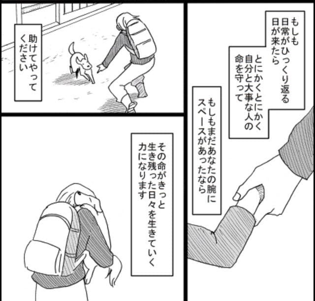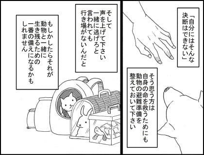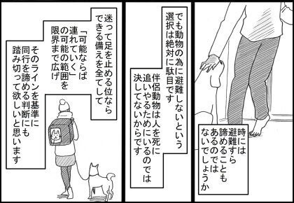 避難して損をすることは決してありません、どうかその時が来たら迷うことなく家族の一員であるその子を連れて避難所に行って下さい。必ず皆さんに笑顔や癒し・優しさをくれ、明日を生きる力を与えてくれます。