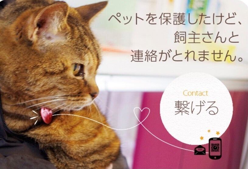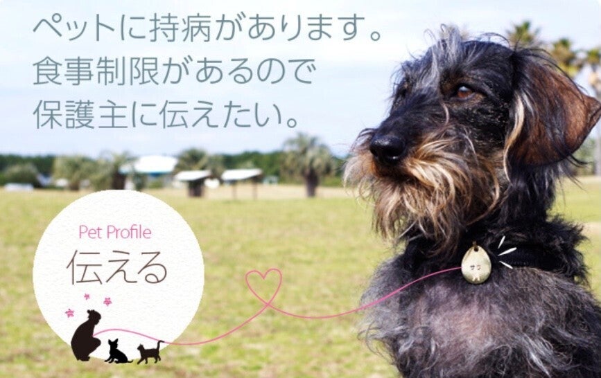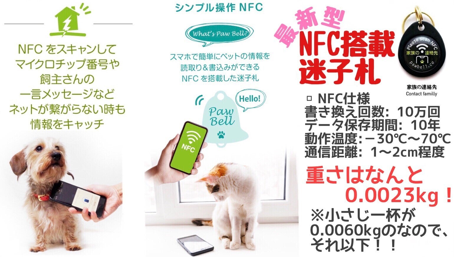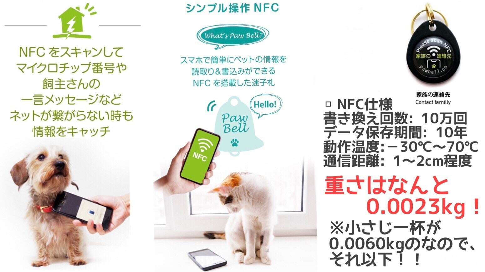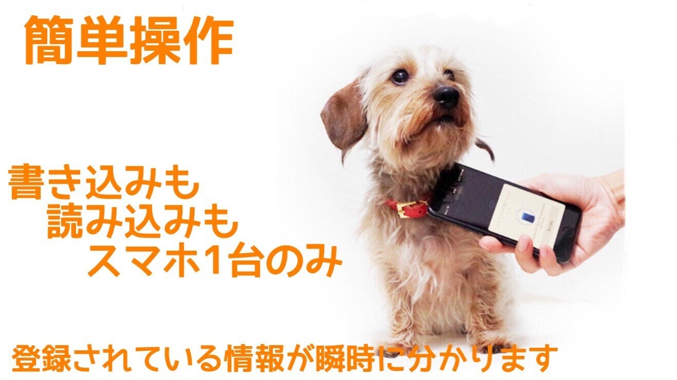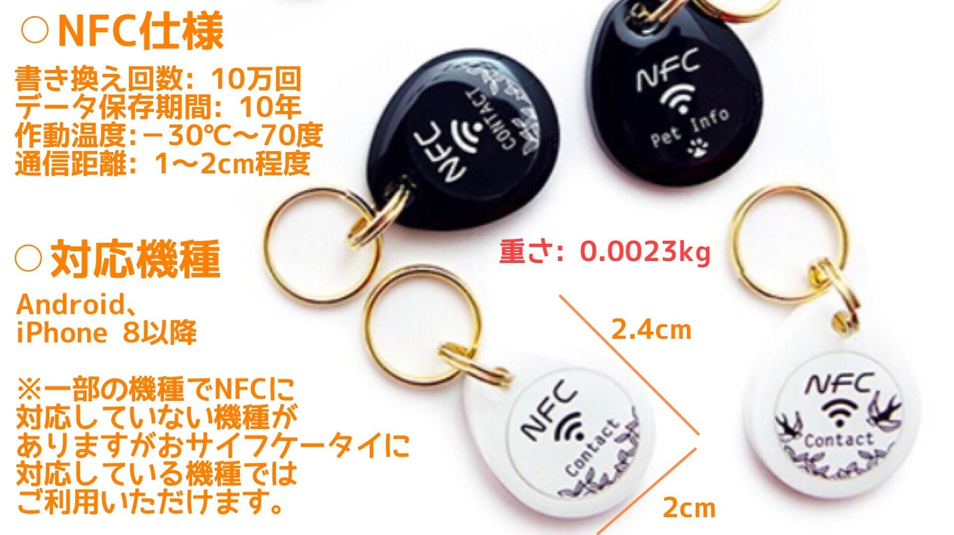 スマートフォンやタブレットなどをかざすとNFCタグに書き込まれた情報(ペットの名前や飼い主さんの名前、電話番号、InstagramのURL、ワクチン接種歴、持病など書き込む内容は自由)が読み取ることができる近距離無線通信です。通信距離は1〜2センチなので遠くから個人情報を盗み取られることはありません。充電の必要もありません。
