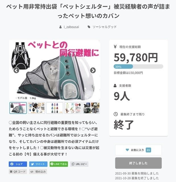 2021/10/29 01:01こんばんは☆ただいまプロジェクトが終了いたしました9名のご支援者様と20名のお気に入り登録して下さった方には心より御礼申し上げますありがとうございました今回はプロジェクト達成となりませんでしたので、9名のご支援者様にはせっかくご支援していただいたお金を返金という形でお戻しすることをお許し下さい。今回は、私の力不足で皆様にリターン商品をお届けできずにプロジェクト終了となりましたが、またこちらに戻って再度全国の飼い主さんに同行避難や同伴避難を呼びかけたいと思います今回はお手紙や「ペットシェルター」をお届けする事は叶いませんが次回挑戦までお待ち下さい必ず皆様にお届けしたいと思っております!この場をお借りして皆様に心から感謝いたします本当にありがとうございました!また挑戦させていただきます!イーザ防災用品 杉浦愛子・Instagramhttps://www.instagram.com/i_zabousai・Facebookhttps://www.facebook.com/izabousai15・Twitterhttps://twitter.com/i_zabousaiペットシェルターhttps://youtu.be/7TGZXfqmLD8・HPhttps://www.i-zabousai.com/ もっと見る残り1日となりました。