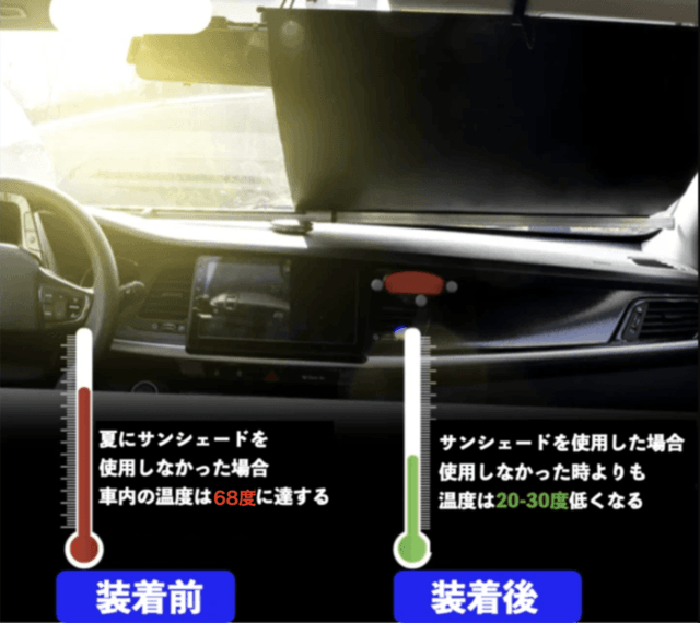 「マジックサンシェード」を取り付けることにより、駐車中の車内温度を低く抑えられるため、エアコン効率もUP! 燃費も抑えられます。
