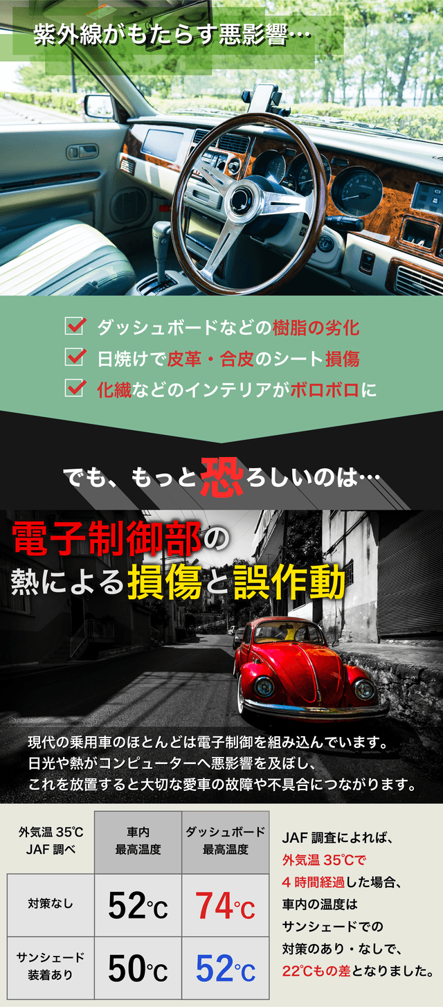 特に注意したいのはダッシュボードの温度です。この場合、実に60℃以上を超える危険性があります。これにより、室内の劣化はもとより、車の電子制御機能に悪影響を及ぼし、最悪事故につながることも!