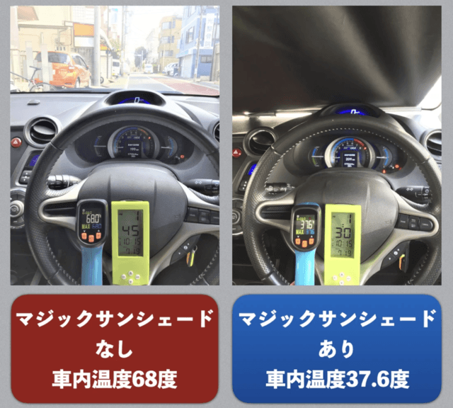 取り付け時が37.6℃だったのがシェードを外してから約15分間で車内温度は68℃まで上昇しました。